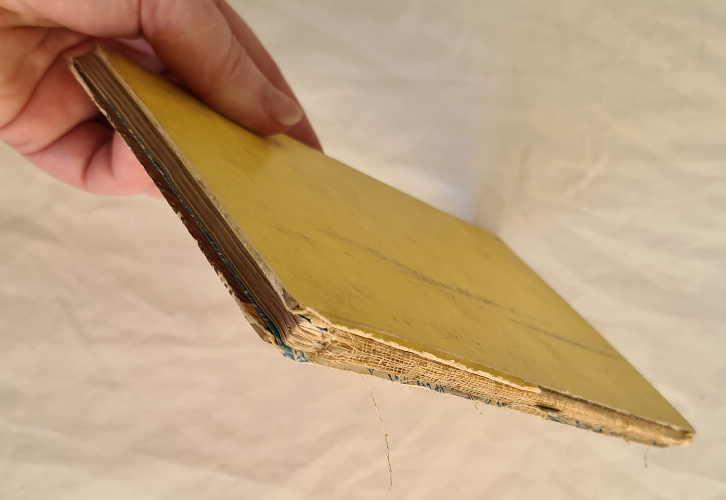 Fair Condition, some edge and shelf wear, some rubbing and bumping to edges and corners, cracked hinge at front cover (separate), no inscriptions, spine missing (see photographs)