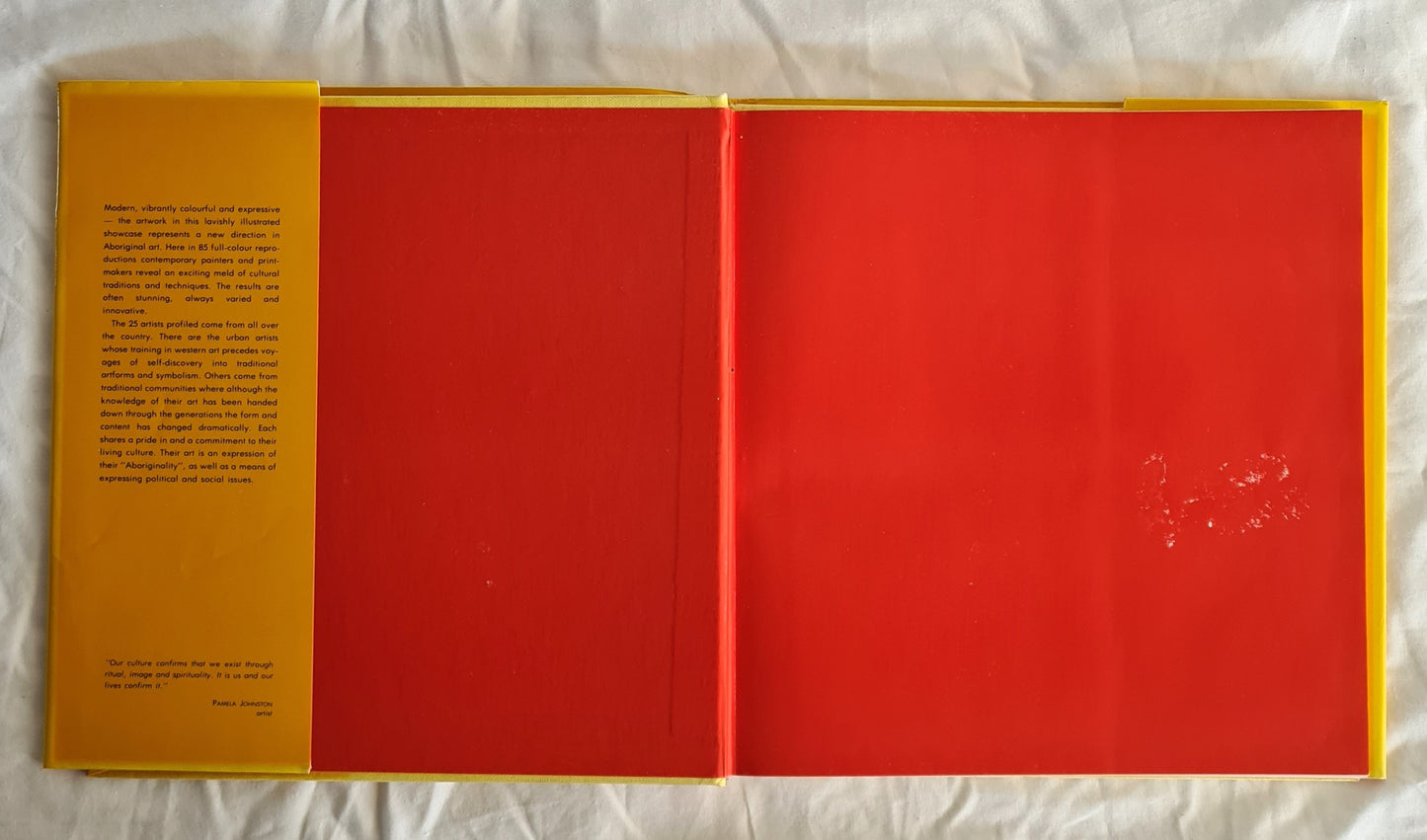 the 25 artists profiled come from all over the country. There are the urban artists whose training in western art precedes voyages of self-discovery into traditional artforms and symbolism. Others come from traditional communities where although the knowledge of their art has been handed down through the generations the form and content has changed dramatically. Each shares a pride in and a commitment to their living culture. Their art is an expression of their “Aboriginality”, as well as a means of expressing political and social issues.”