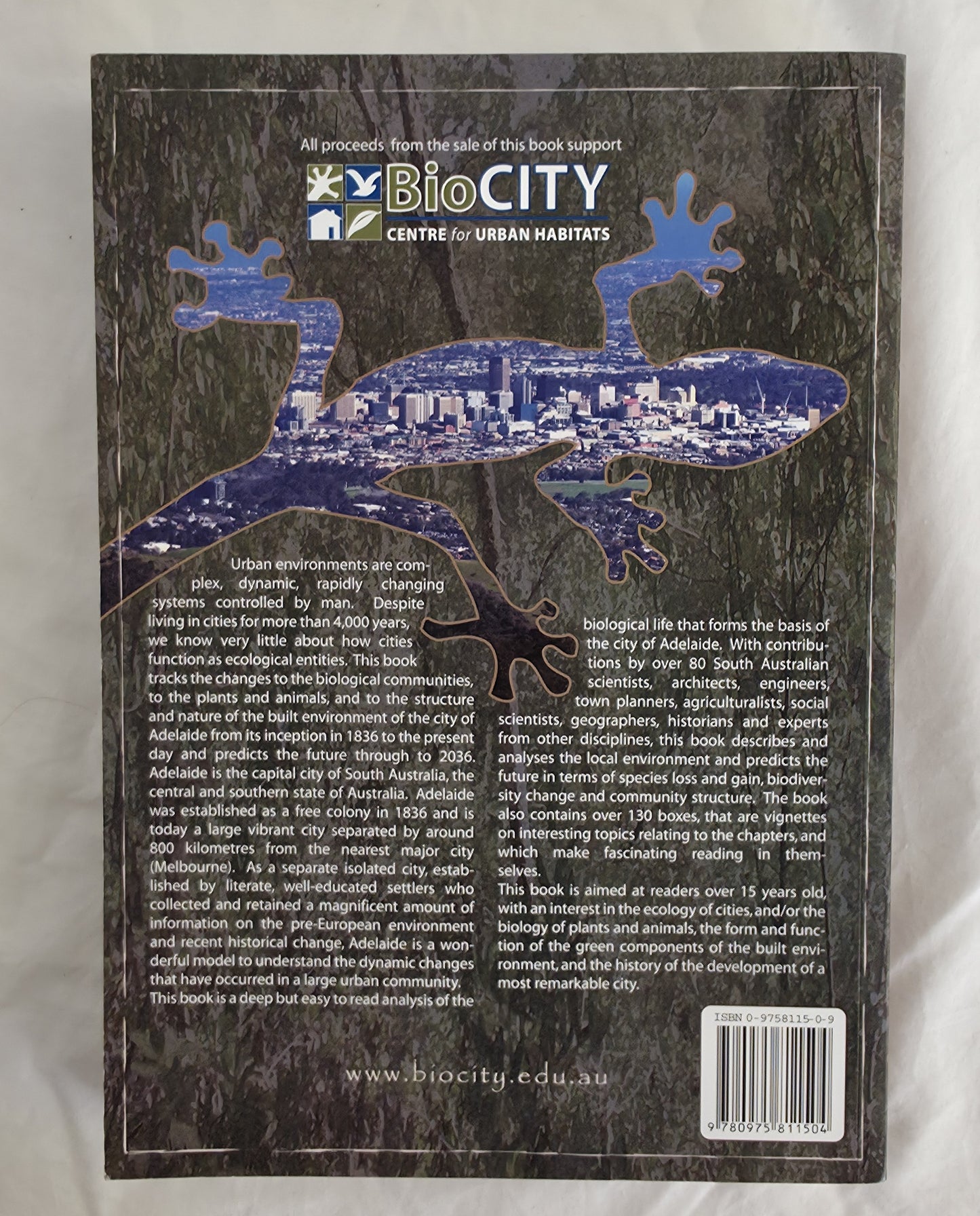 “Urban environments are complex, dynamic, rapidly changing systems controlled by man. Despite living in cities for more than 4000 years, we know very little about how cities function as ecological entities. This book tracks the changes to the biological communities, to the plants and animals, and to the structure and nature of the built environment of the city of Adelaide from its inception in 1836 to the present day and predicts the future through to 2036.”