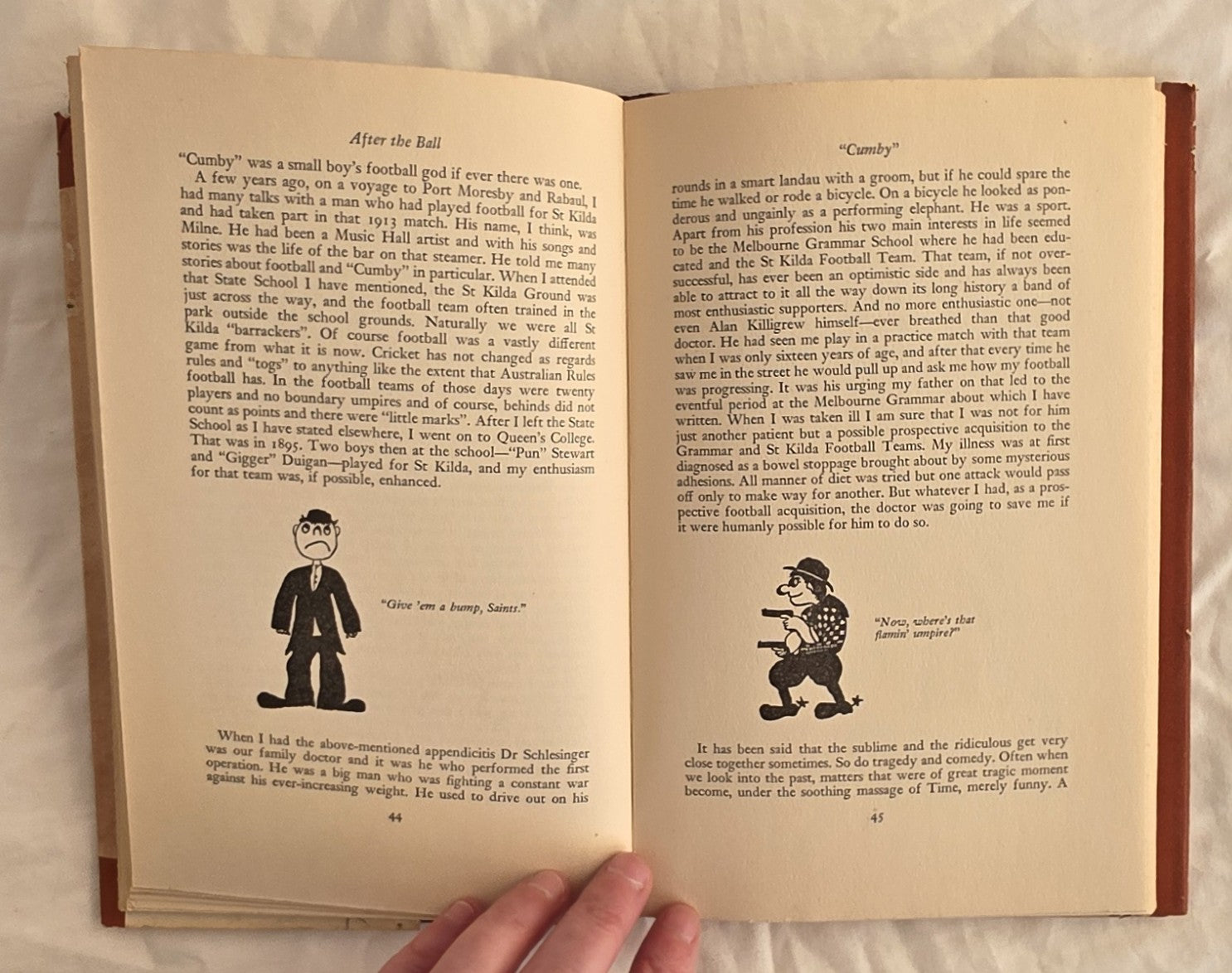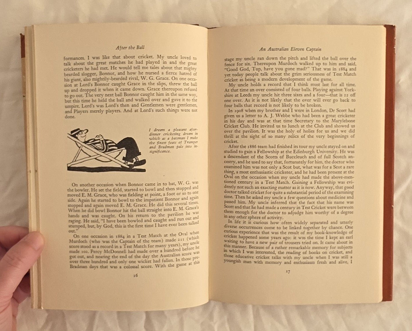But sport, whether it was cricket, cycling, football, horse-racing, boxing, wrestling, fishing, tennis or one of the more obscure games of his youth, like egg-cap, duckstone, cross-tig, stag-knife or toodle-em-bucks, has not been an entirely serious business with him; his cheering sense of what is funny keeps his memories sparkling. Anecdotes about others, anecdotes against himself – this is the stuff of the book, which is enlivened by his own delightful mocking caricatures.”
