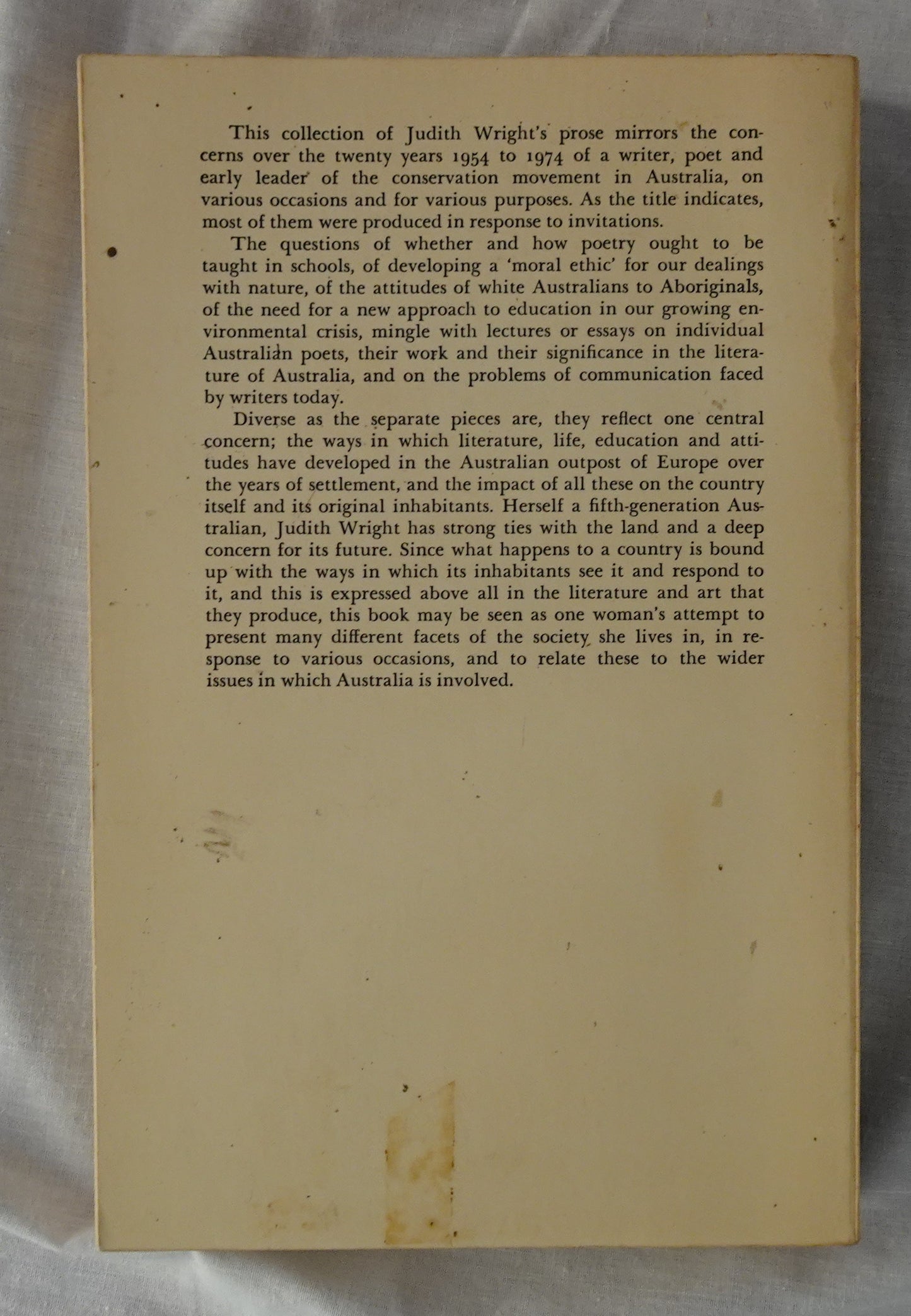“This collection of Judith Wright’s prose mirrors the concerns over the twenty years 1954 to 1974 of a writer, poet and early leader of the conservation movement in Australia, on various occasions and for various purposes. As the title indicates, most of them were produced in response to invitations.