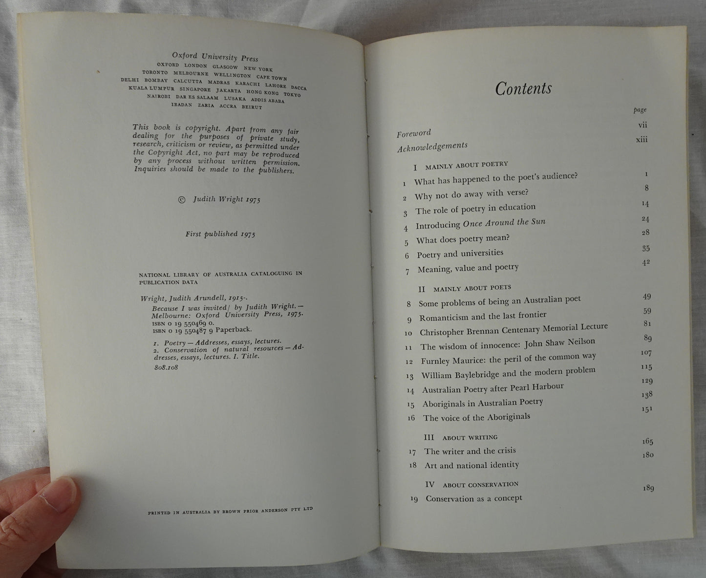 the questions of whether and how poetry ought to be taught in schools, of developing a ‘moral ethic’ for out dealings with nature, of the attitudes of white Australians to Aboriginals, of the need for a new approach to education in out growing environmental crisis, mingle with lecture or essays on individual Australian poets, their work and their significance in the literature of Australia, and on the problems of communication faced by writers today.”