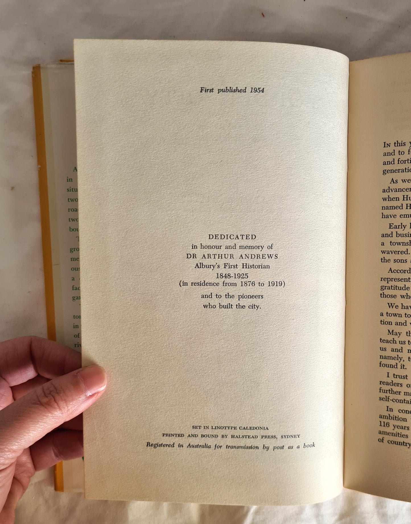 Albury City Council, 1954, [First Edition], ISBN 0207144338, black and white photographic plates, black and white photographic frontispiece, hardcover, dustjacket