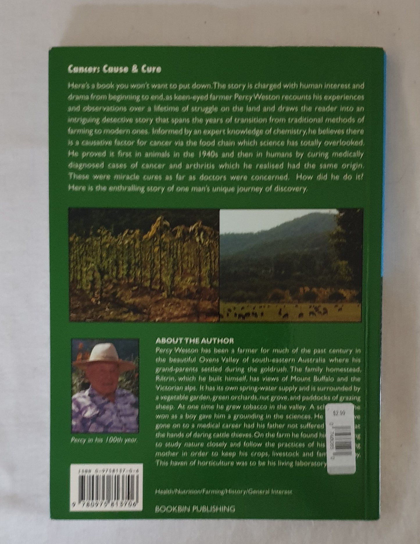 "Here's a book you won't want to put down. The story is charged with human interest and drama from beginning to end, as keen-eyed farmer Percy Weston recounts his experiences and observations over a lifetime of struggle on the land and draws the reader into an intriguing detective story that spans the years of transition from traditional methods of farming to modern ones. Informed by an expert knowledge of chemistry, he believes there is a causative factor for cancer via the food chain which science has totally overlooked. He proved it first in animals in the 1940s and then in humans by curing medically diagnosed cases of cancer and arthritis which he realised had the same origin. These were miracle cures as far as doctors were concerned. How did he do it? Here is the enthralling story of one man's unique journey of discovery."