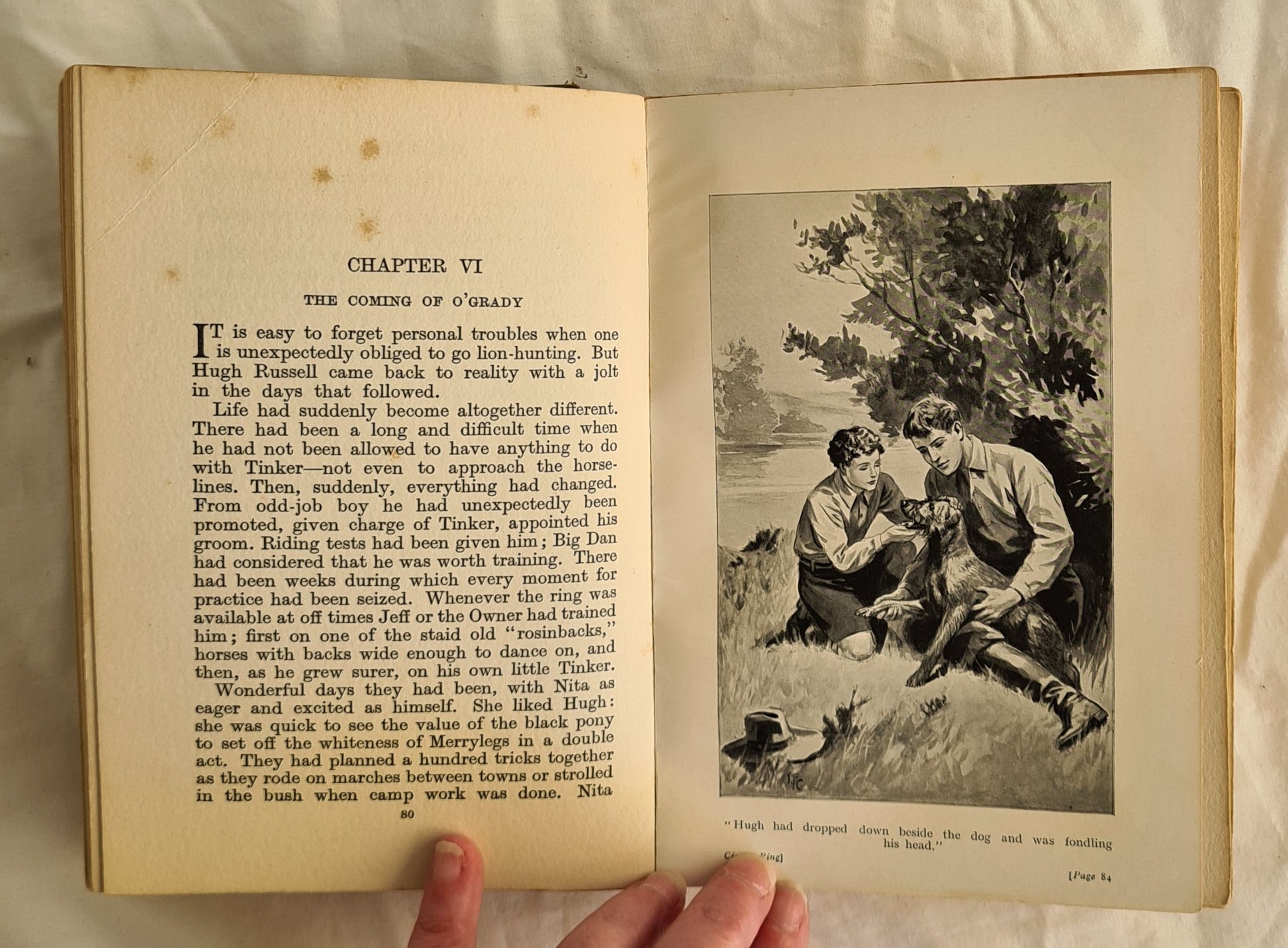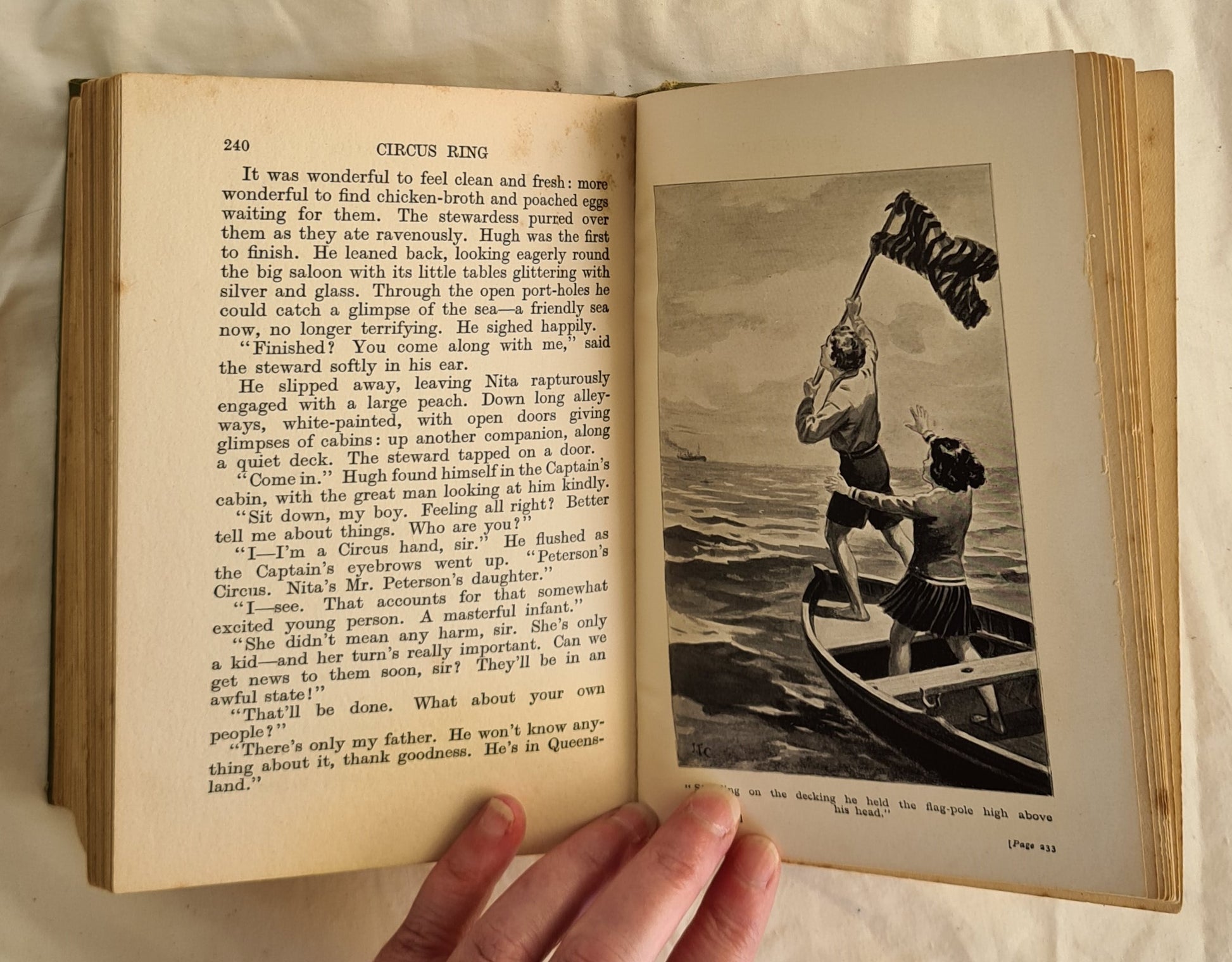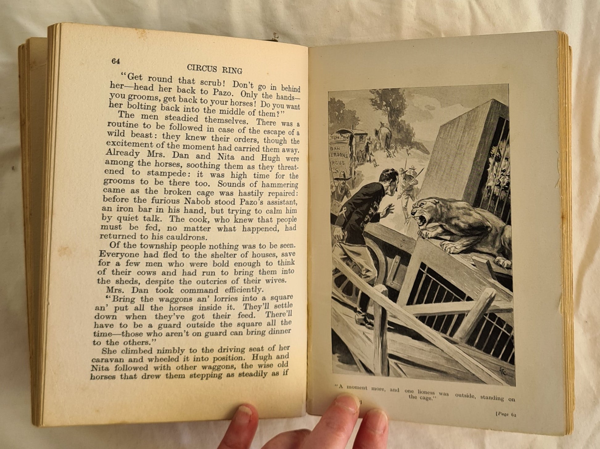 “All young people are thrilled to watch the exciting circus. In this story, we look behind the scenes and see the ups and downs of circus life, and the courage and laughter of the people who so amuse and thrill us. Hugh Russell, the boy clown and rider, with Nita, daughter of the Circus, make lots of new friends in this delightful story of comradeship and adventure.”