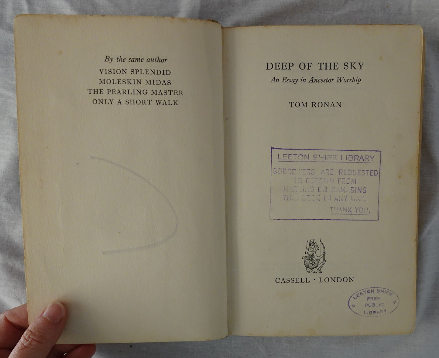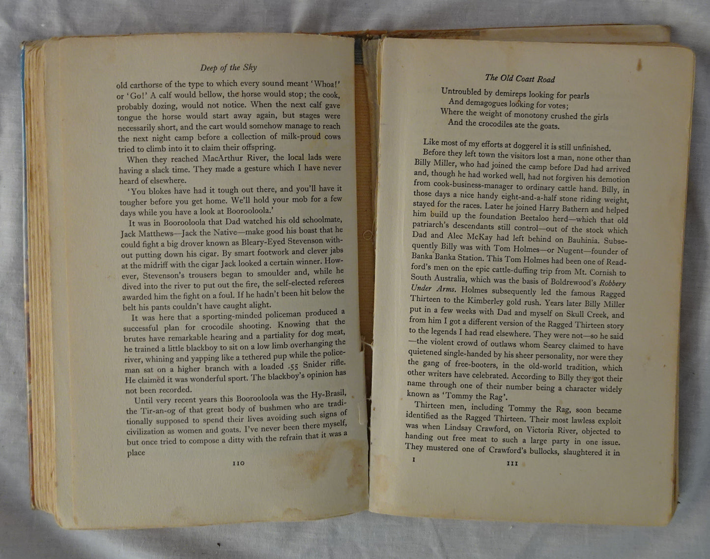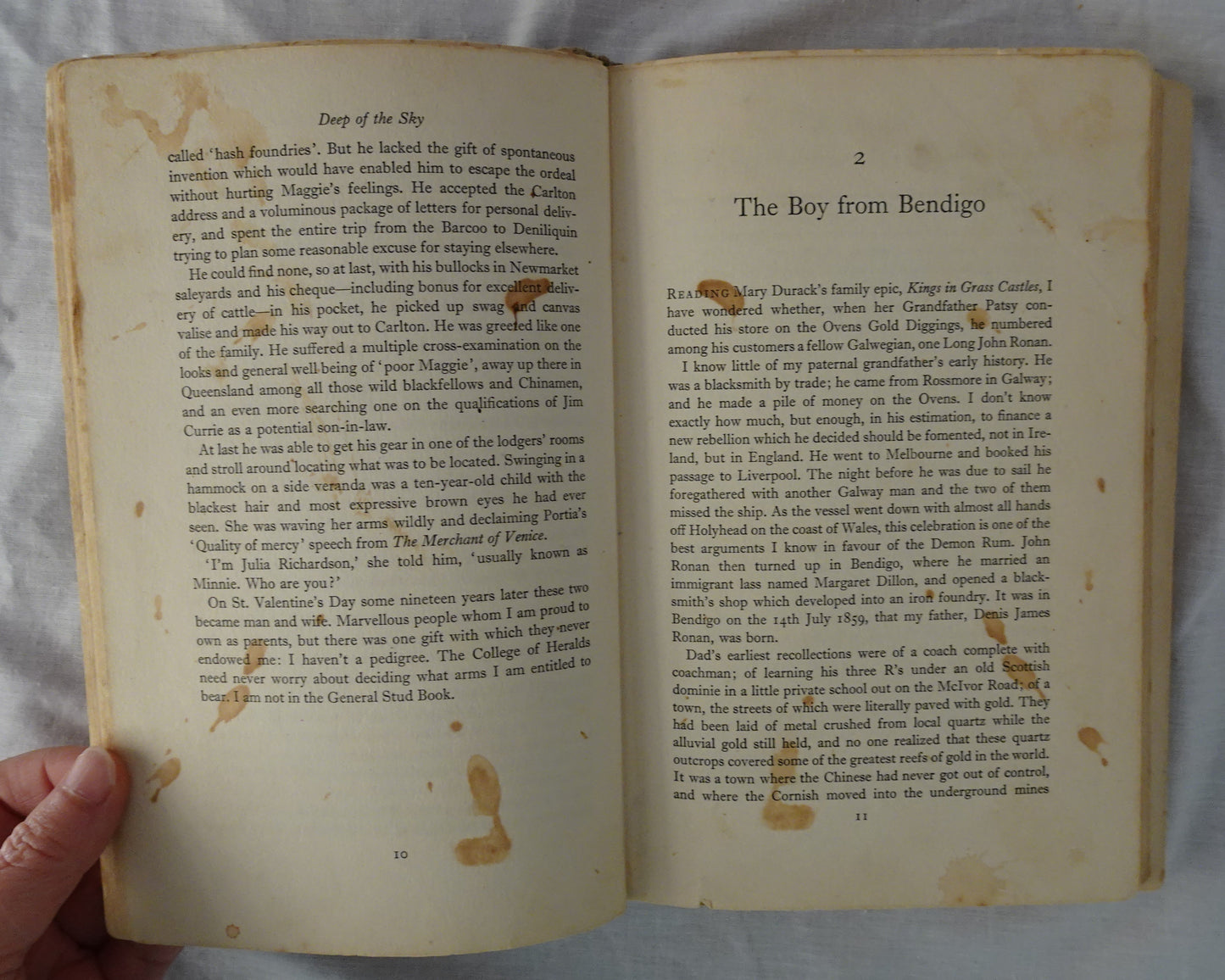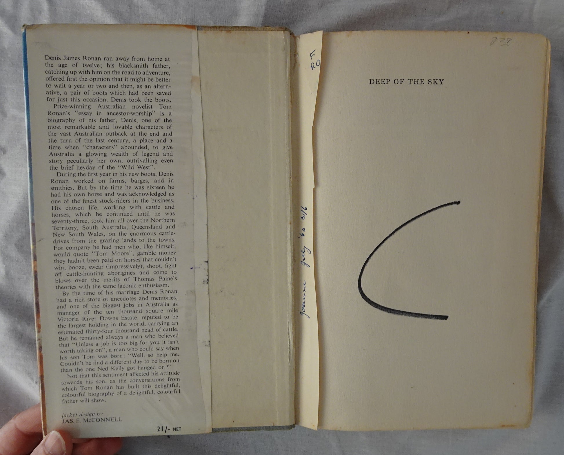 “During the first year in his new boots, Denis Ronin worked on farms, barges, and in smithies. But by the time he was sixteen he had his own horse and was acknowledged as one of the finest stock-riders in the business. His chosen life, working with cattle and horses, which he continued until he was seventy-three, took him all over the northern Territory, South Australia, Queensland and New South Wales, on the enormous cattle drives from the grazing lands to the towns.”