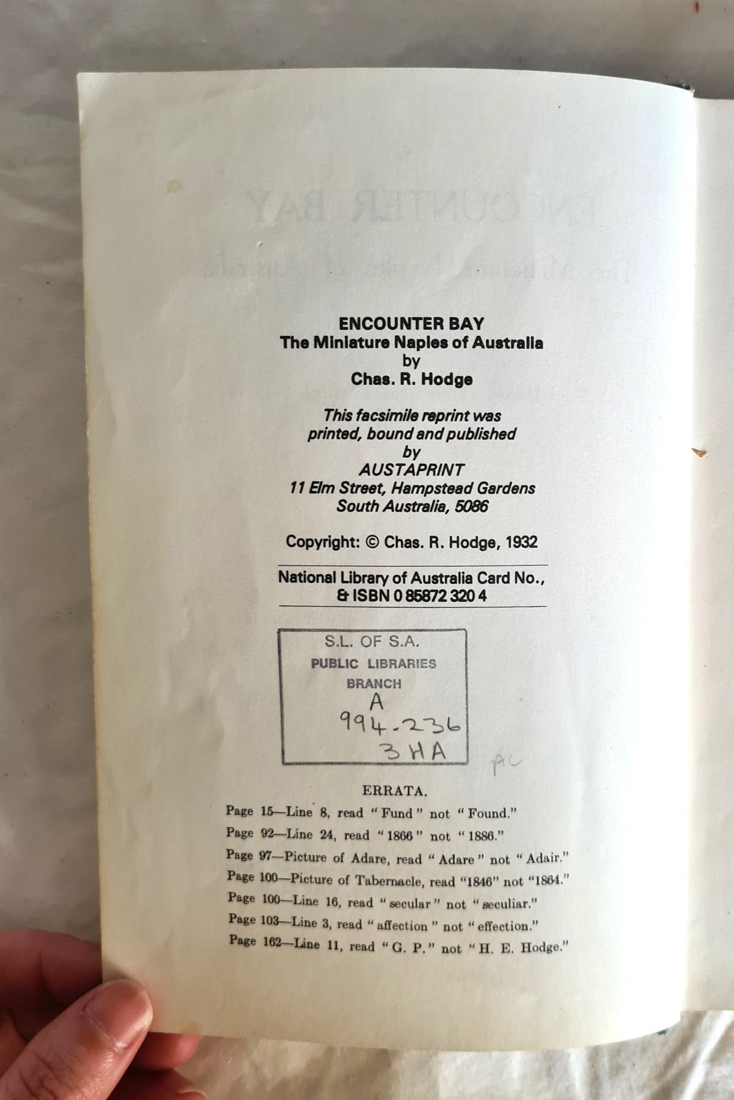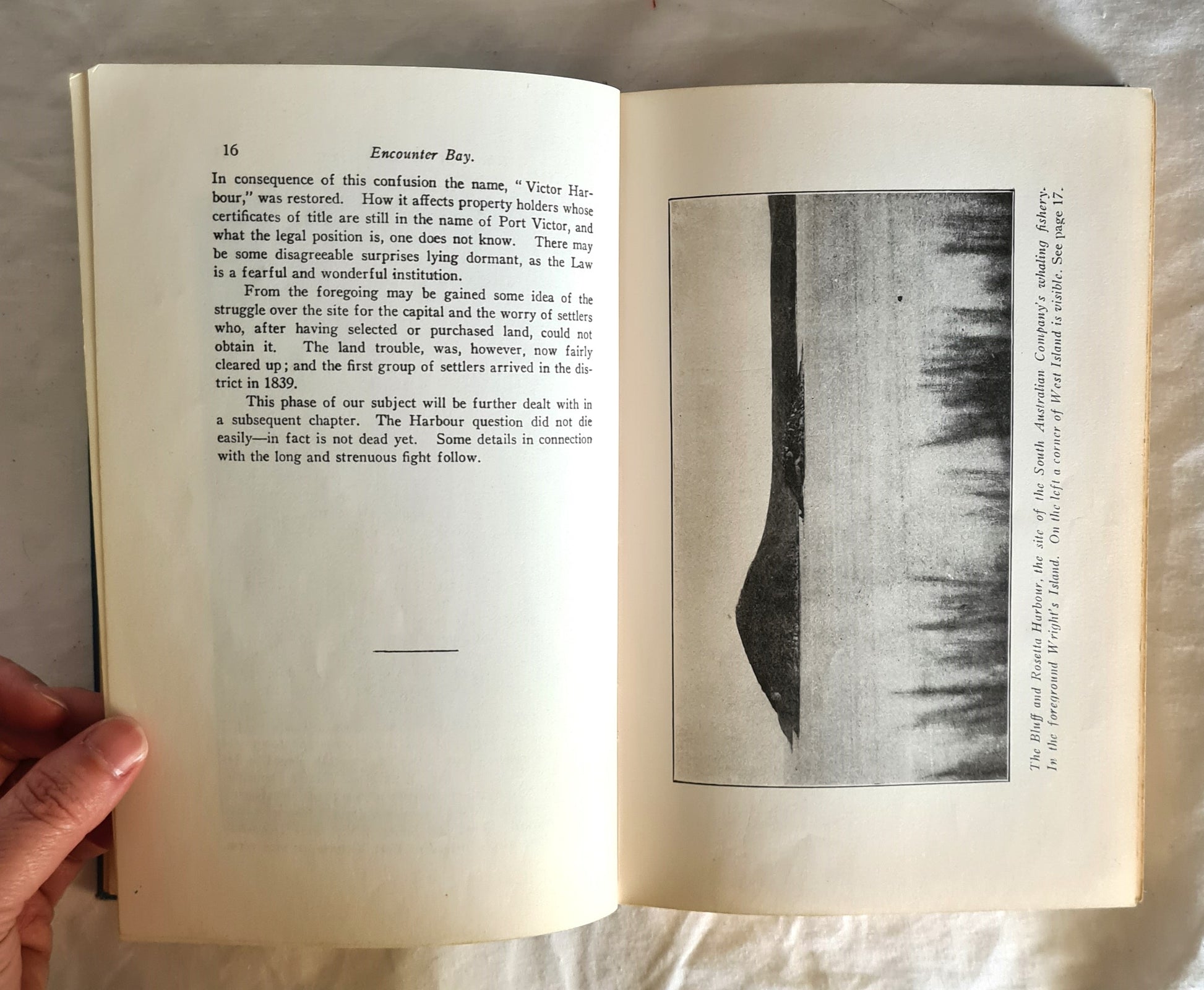 The first settlers arrived in 1839. They were soon followed by others, who, satisfied with its potentialities, laid out their capital in full confidence. For some years their optimism was justified, but the diversion of the Murray trade to Port Adelaide resulted in disaster to the southern towns. The book probably contains more than usual of what may perhaps be termed domestic details, the reason being the author’s desire to make it useful to Municipal Councils on the Coast as a book of reference. It is a matter for great regret that many old civic and church records, which would be of historical value today, have disappeared.”