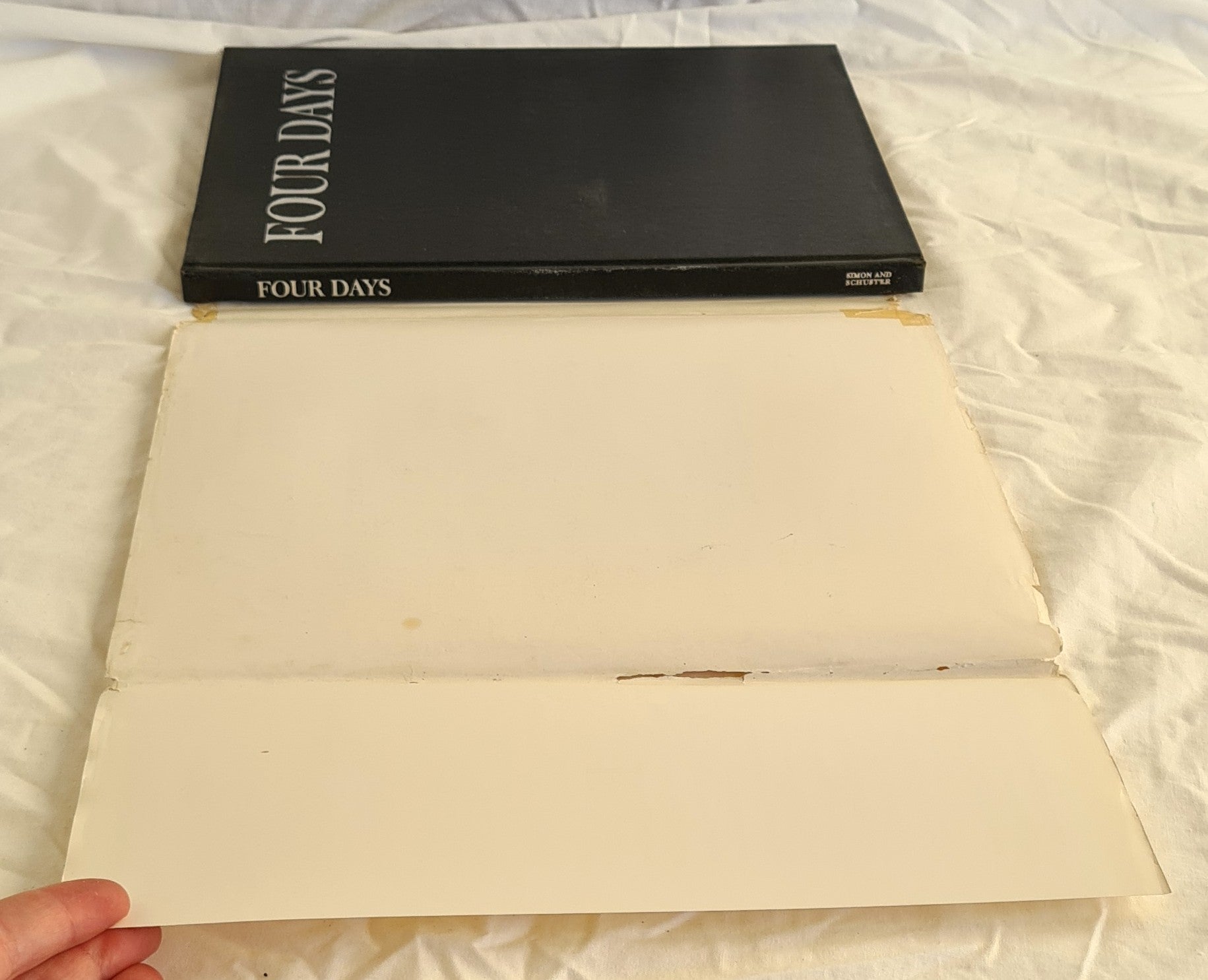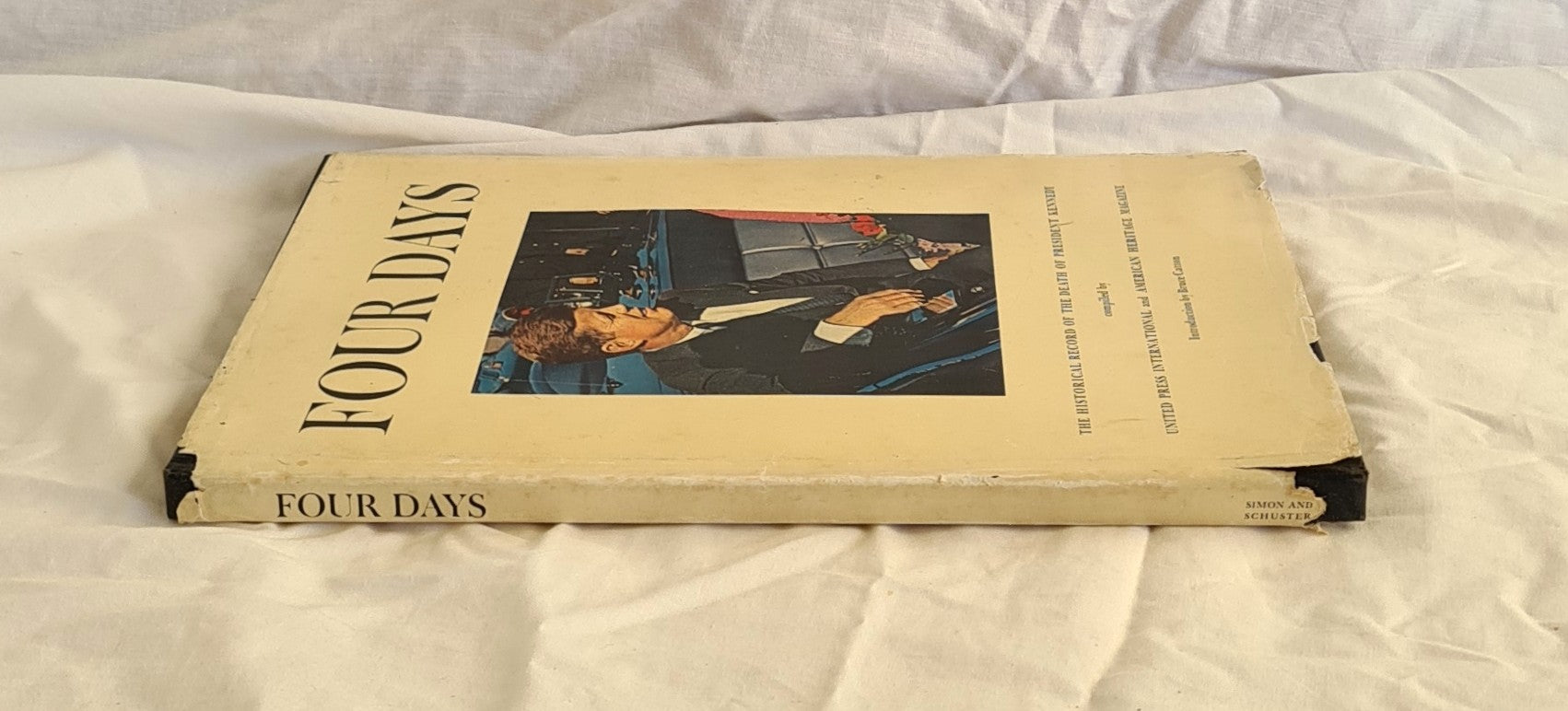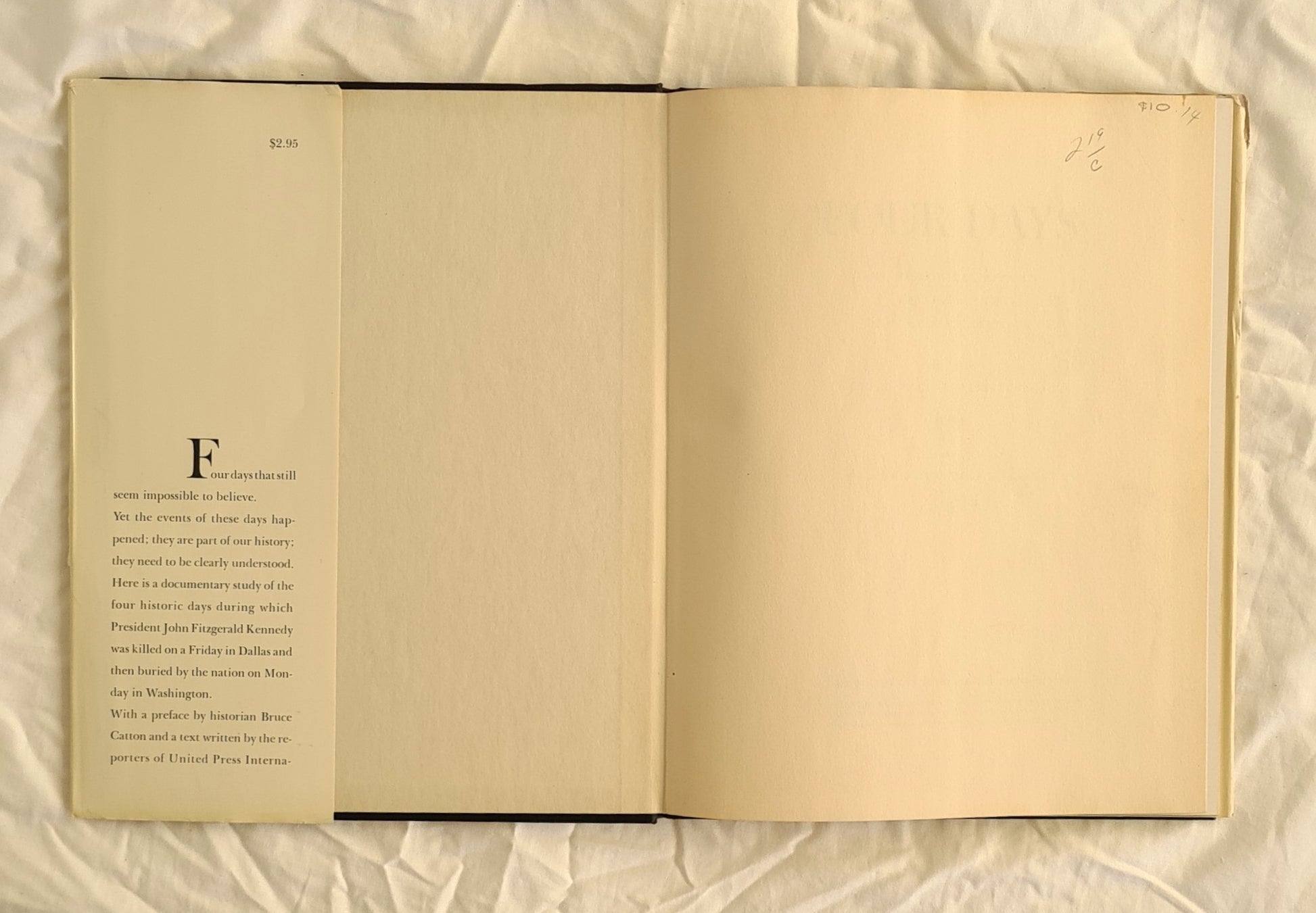 “Four Days that still seem impossible to believe. Yet the events of these days happened: they are part of our history; they need to be clearly understood. Here is a documentary study of the four historic days during which President John Fitzgerald Kennedy was killed on a Friday in Dallas and then buried by the nation on Monday in Washington. With a preface by historian Bruce Catton and a text written by the reporters of United Press International and the editors of American Heritage magazine, this book is a full presentation of the incredible events that affected this nation and the world as few incidents have done in the memory of man.