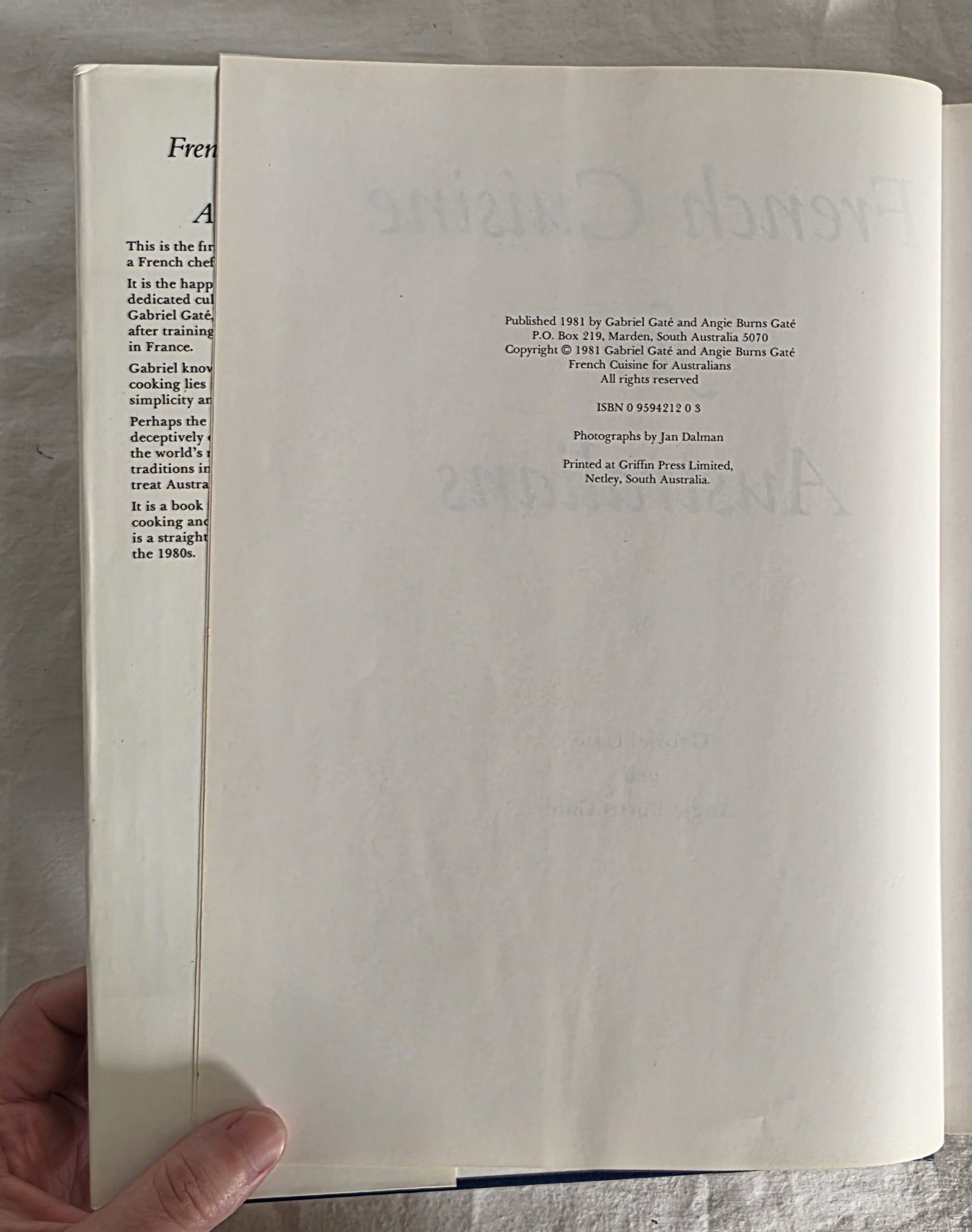 “This is the first cookery book written by a French chef specially for Australians. It is the happy product of three years of dedicated culinary exploration by Gabriel Gate, who cooks in Australia after training in three-star restaurants in France.”