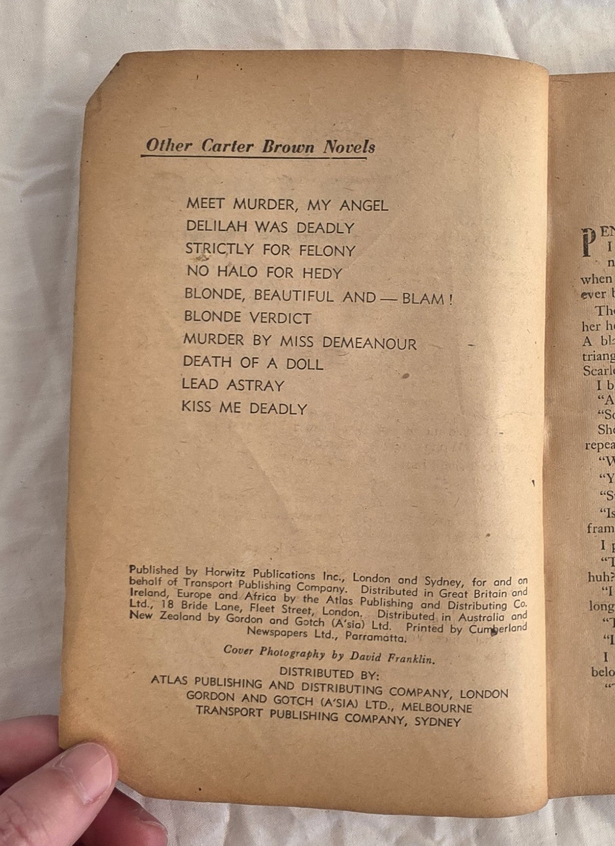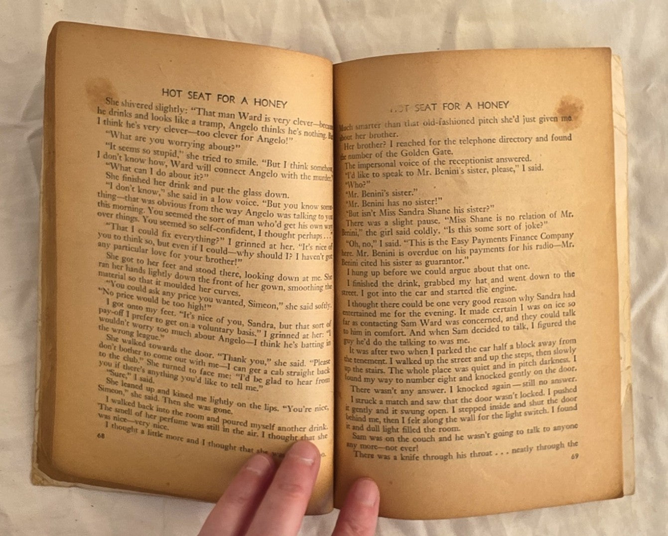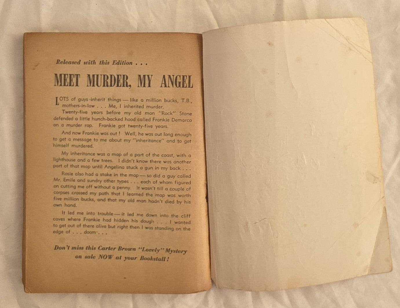 “The zany millionaire who’d hired me had his penthouse guarded as if it held more gold than Fort Knox. Well, maybe Dolly and Mamie were every bit as valuable – and who’d want to share ‘em with anyone, anyway. But my client didn’t live long enough to enjoy their company – and I couldn’t collect my fifty thousand dollars till I found out who’d put a knife in his throat. Sure, Dolly and Mamie told me all they knew – and it would have filled a book. Only I wasn’t writing one. I didn’t have time. I had a murder on my hands and someone had me lined up as a victim, too...”