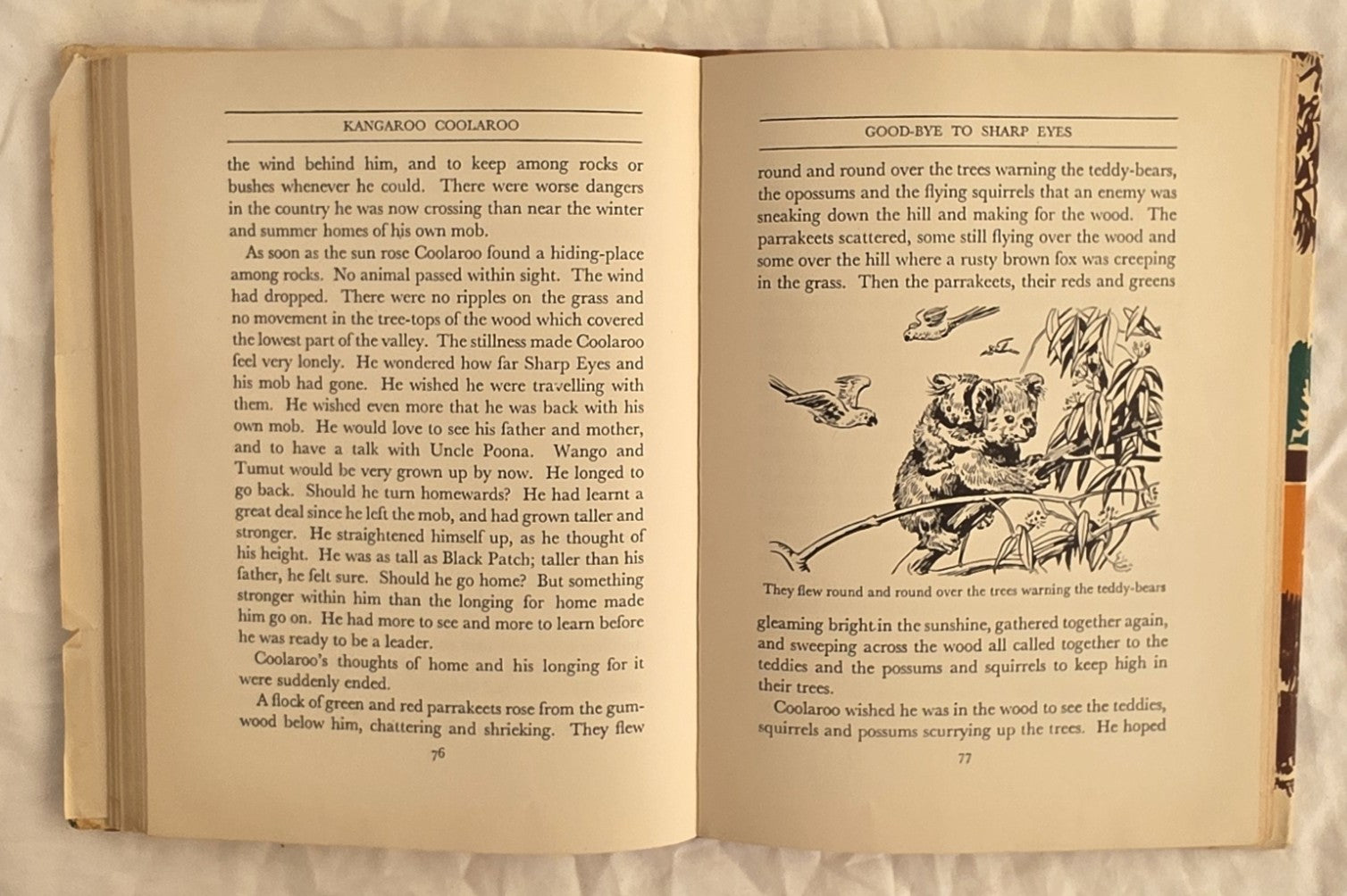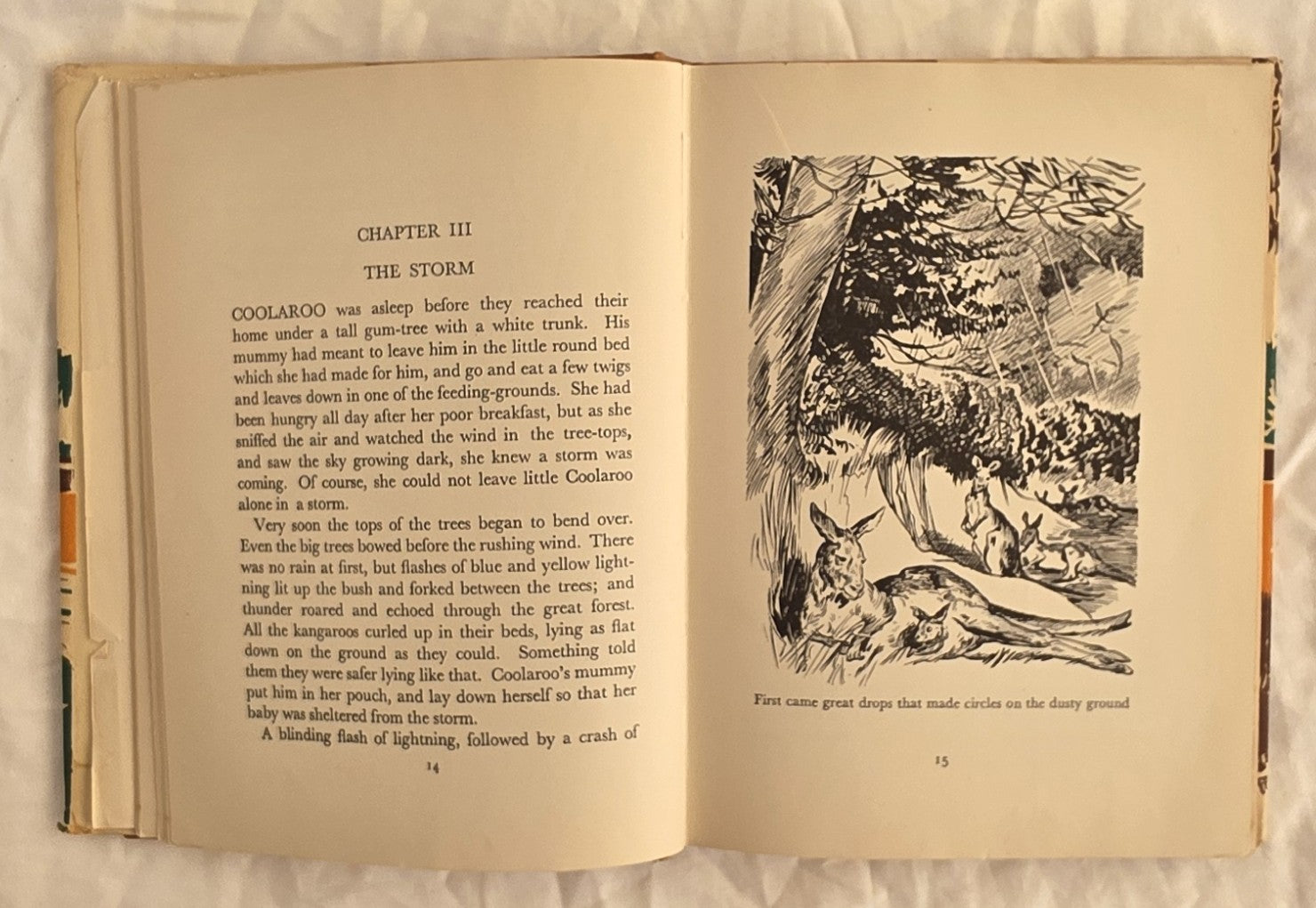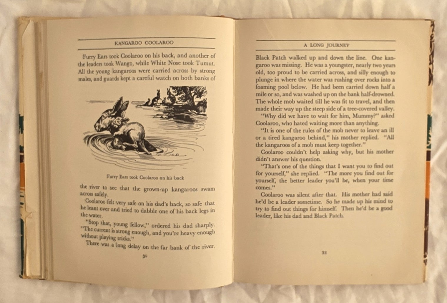 “Coolaroo was a tiny kangaroo, and he and his parents belonged to a “mob” or band of kangaroos living in the bush of southern Australia. Coolaroo’s father was a leader of the mob, and as Coolaroo grew into a strong (and sometimes rather uppish) young joey his great ambition was to become a leader too. So, as all prospective leaders must, he took to the bush and the grasslands alone, to learn about their life, their secrets and their dangers. He met creatures friendly to the mob, and he skirmished with some enemies, until at last, after an absence of several years, he rejoined the mob and became the finest leader they had ever known.”
