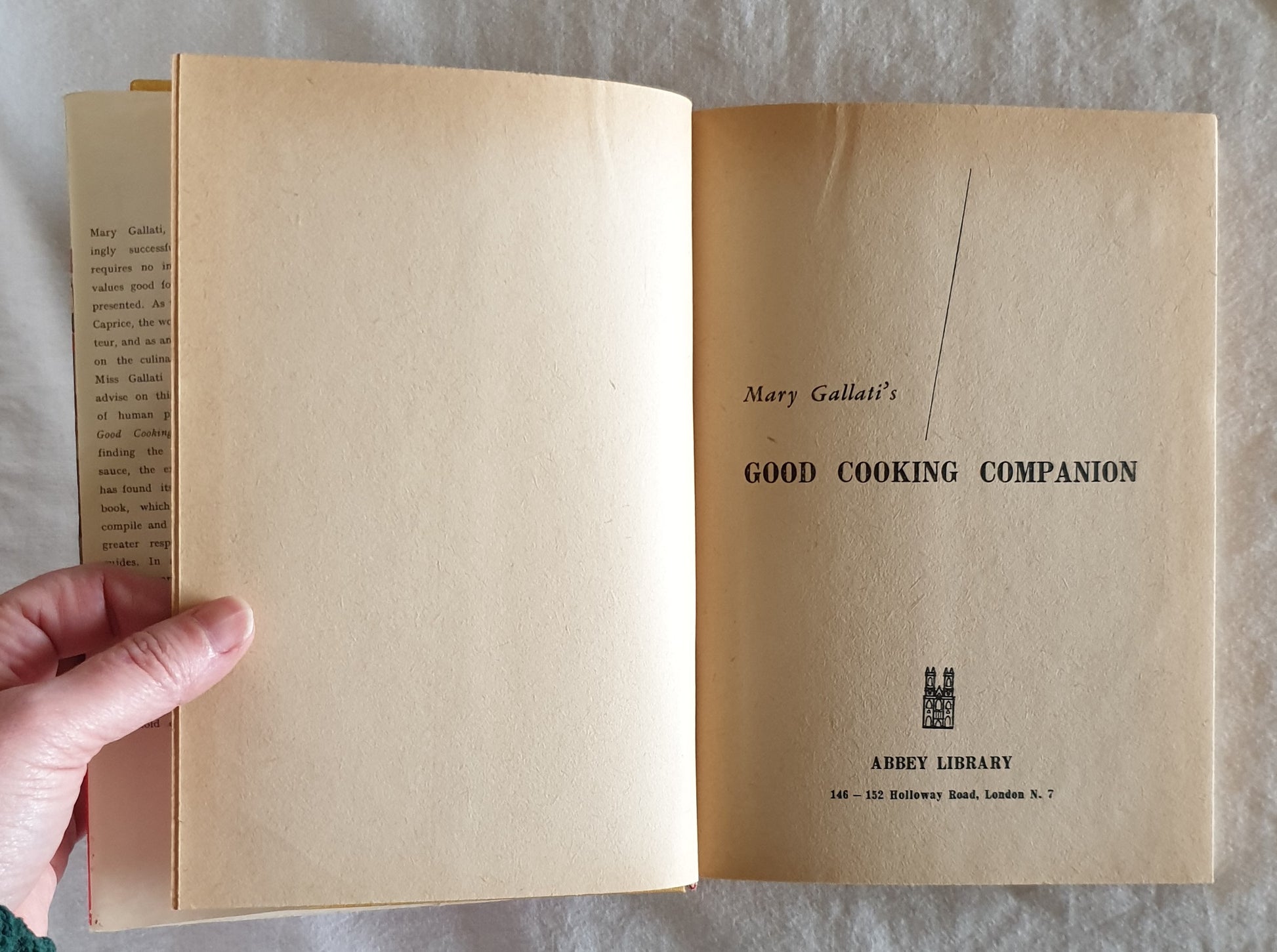 "In Mary Gallati's Good Cooking Companion her flair for finding the unusual dish, the delectable sauce, the extra mouth-watering flavour, has found its fullest expression. Yet this book, which has taken three years to compile and perfect, differs in an even greater respect from all other cookery guides. In addition to covering an encyclopedic range of food, with expert advice on when and what to buy, Miss Gallati goes on to show how left-overs can be made to yield fresh series of delicious meals."