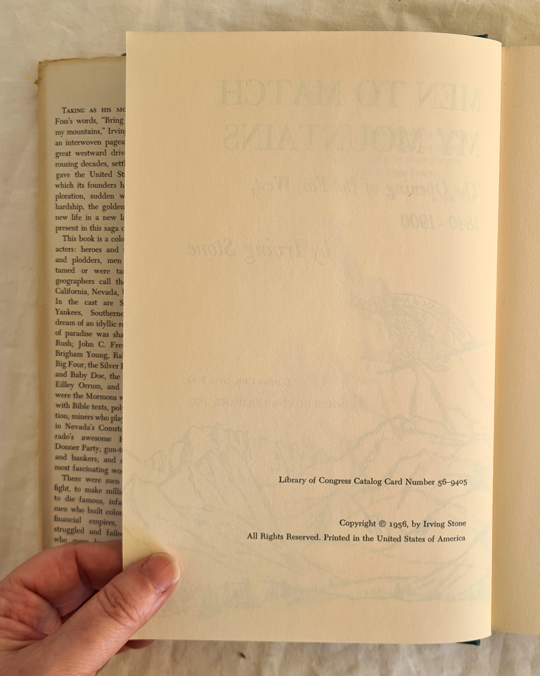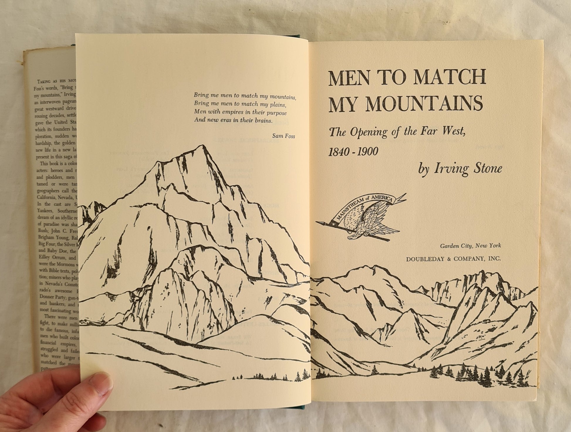 “Taking as his motif the poet Sam Foss’s words, “Bring me men to match my mountains,” Irving Stone has created an interwoven pageant of stories of the great westward drive which, in a few rousing decades, settled a continent and gave the United States dimensions of which its founders hardly dreamed. Exploration, sudden wealth, unspeakable hardship, the golden chance to build a new life in a new land – all these are present in this saga of human aspiration.”