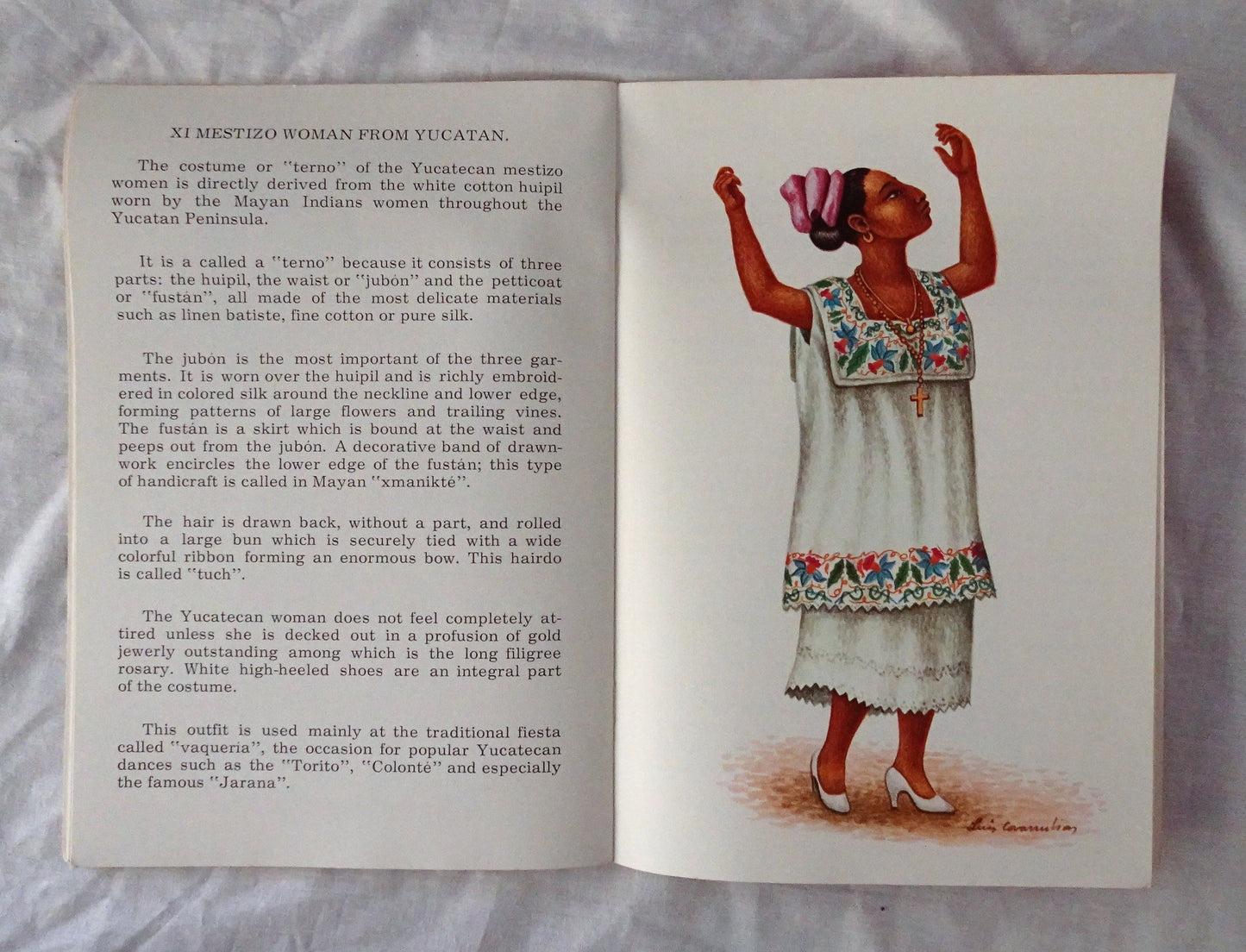 “Since remote times, Mexican wearing apparel has been varied, rich and of spectacular appearance. In pre-Hispanic periods, and even today in many cases, it had ritual and caste significance, or distinguished the many ethnic groups that inhabited Meso-America. Our earliest knowledge of Mexican costume comes from the small clay figures produced by artisans of the so-called pre-classic era more than 3000 years ago. It consisted exclusively of different kinds of headdress, necklaces, anklets, and paint on an otherwise totally nude body. Later on, shorts, skirts, breech cloths and other simple adornments were introduced, with hair styles and headdresses becoming more complicated. And so, in time, the costume became more and more elaborate and ornate, especially among the men, until it reached the stage of incredible magnificence that we discover in representations of the Maya hierarchy.”