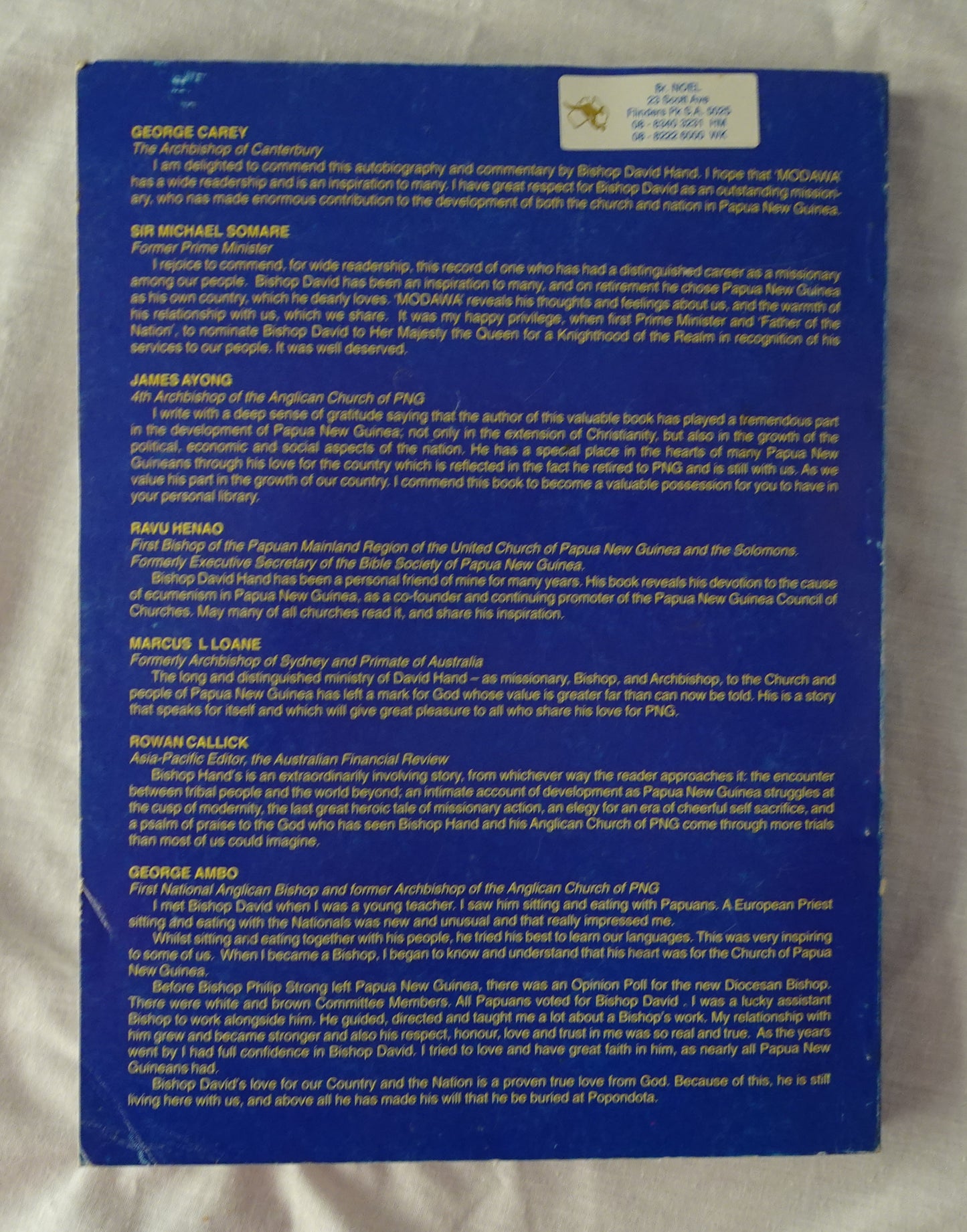 One suggested sub-title for Modawa, was The Development of a Relationship. I personalised this by sub-titling it Papua New Guinea and Me, 1946-2002. For it is not just a catalogue of autobiographical occurrences, but an attempt to identify what my adopted country and I have done and been for each other for over half a century. Also in what ways people, governments, my church and the other churches have or have not collaborated and cooperated in the development of each other and of our nation.”