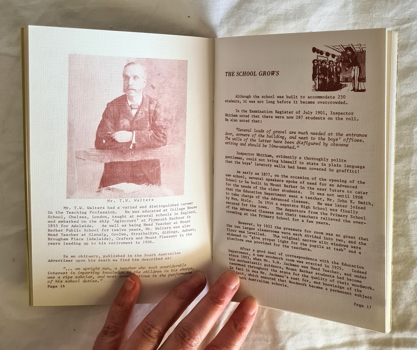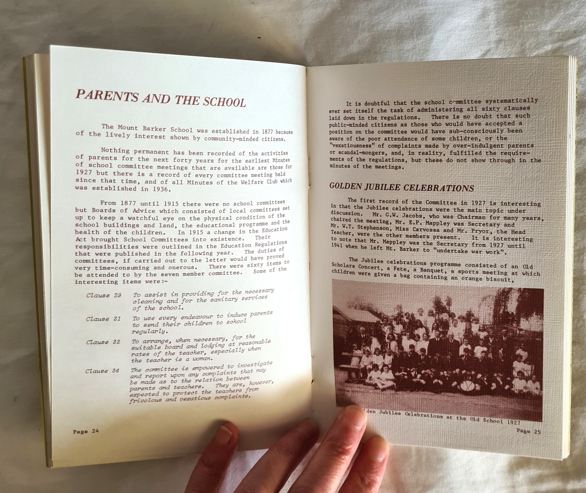 A brief history of the town, leading up to the opening of the school, has been included in order to put the school in its historical and social context. The achievements and foresight of the early pioneers as they are outlined in this record are remarkable when one reflects on the development that was made within the first forty years of the first settlement in South Australia in 1836 and in Mt. Barker in 1839.”