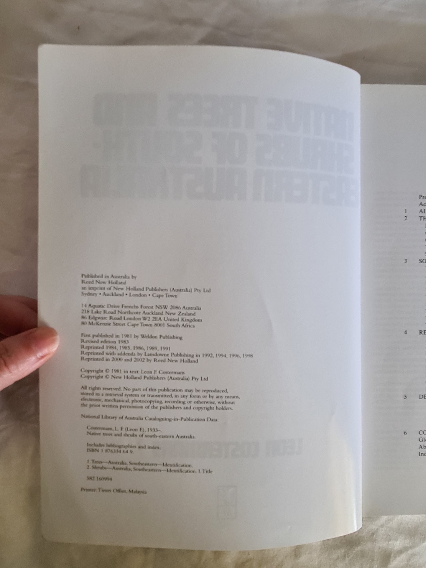 “Native Trees and Shrubs of South-eastern Australia embraces an area that stretches from the Flinders and Mt Lofty Ranges in South Australia, across Victoria and southern New South Wales to the NSW South Coast. It records the land and its vegetation in a scientifically accurate, but accessible, style. Virtually all species of native trees and larger shrubs in this area are described, and their occurrences are related to the features of their environments – events of the past, geology, landforms, soil, and climatic conditions.