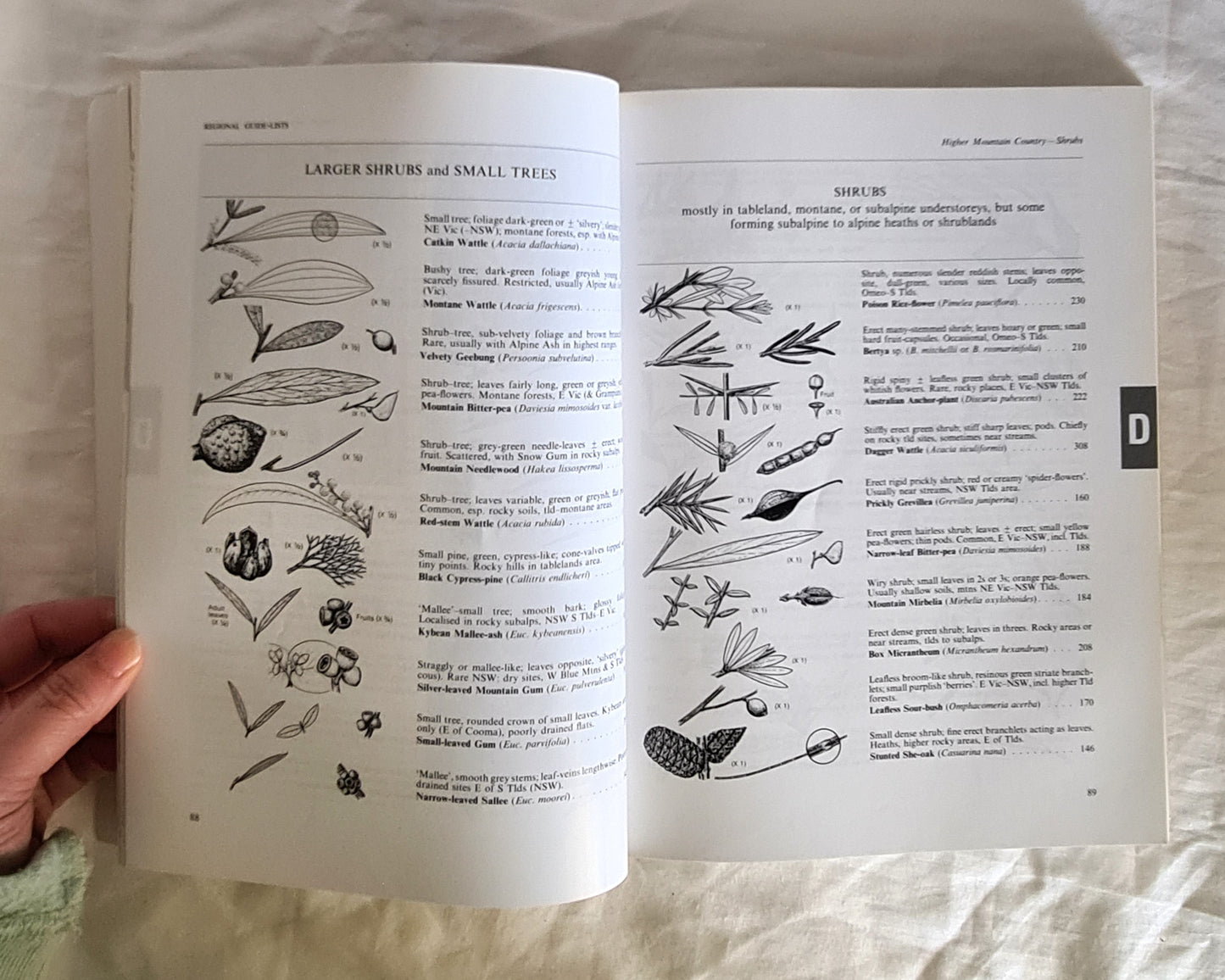 The brief descriptions of places of special interest, as well as the eight regional ‘guide-lists’ that cover the coast, hills and ranges, high-mountain country, and various inland areas, assist anyone exploring such regions to identify the trees and shrubs.”