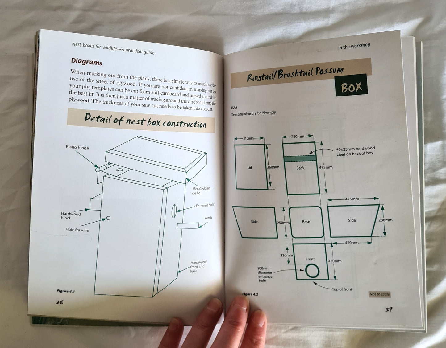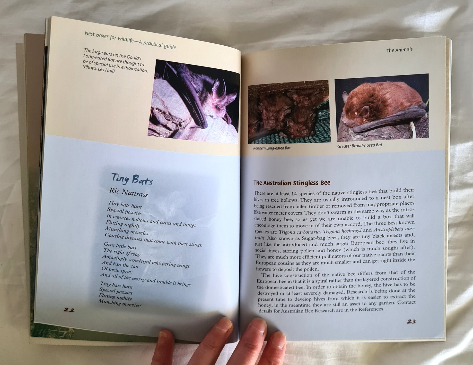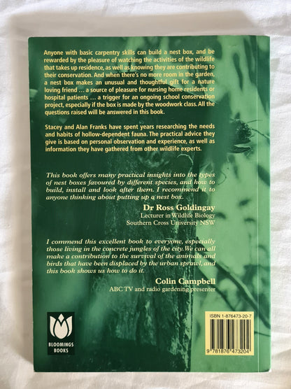 “Anyone with basic carpentry skills can build a nest box, and be rewarded by the pleasure of watching the activities of the wildlife that takes up residence, as well as knowing they are contributing to their conservation. And when there’s no more room in the garden a nest box makes an unusual and thoughtful gift for a nature loving friend… a source of pleasure nursing home residents or hospital patients… a trigger for an ongoing school conservation project, especially if the box is made by the woodwork class. All the questions raised will be answered in this book.”