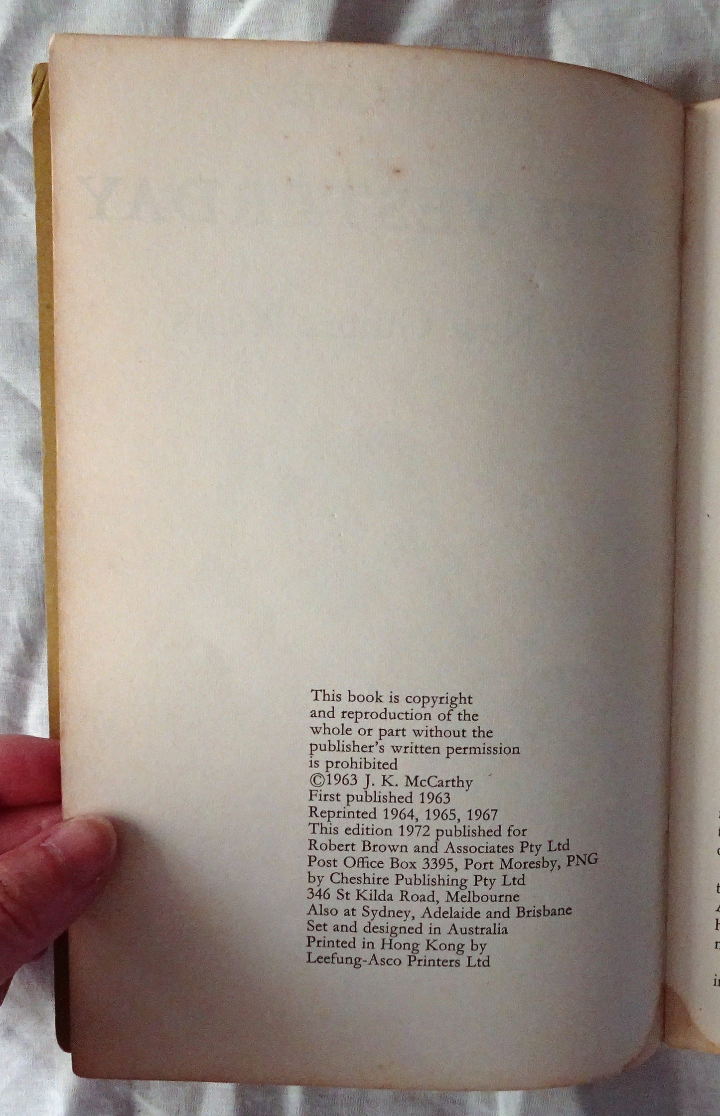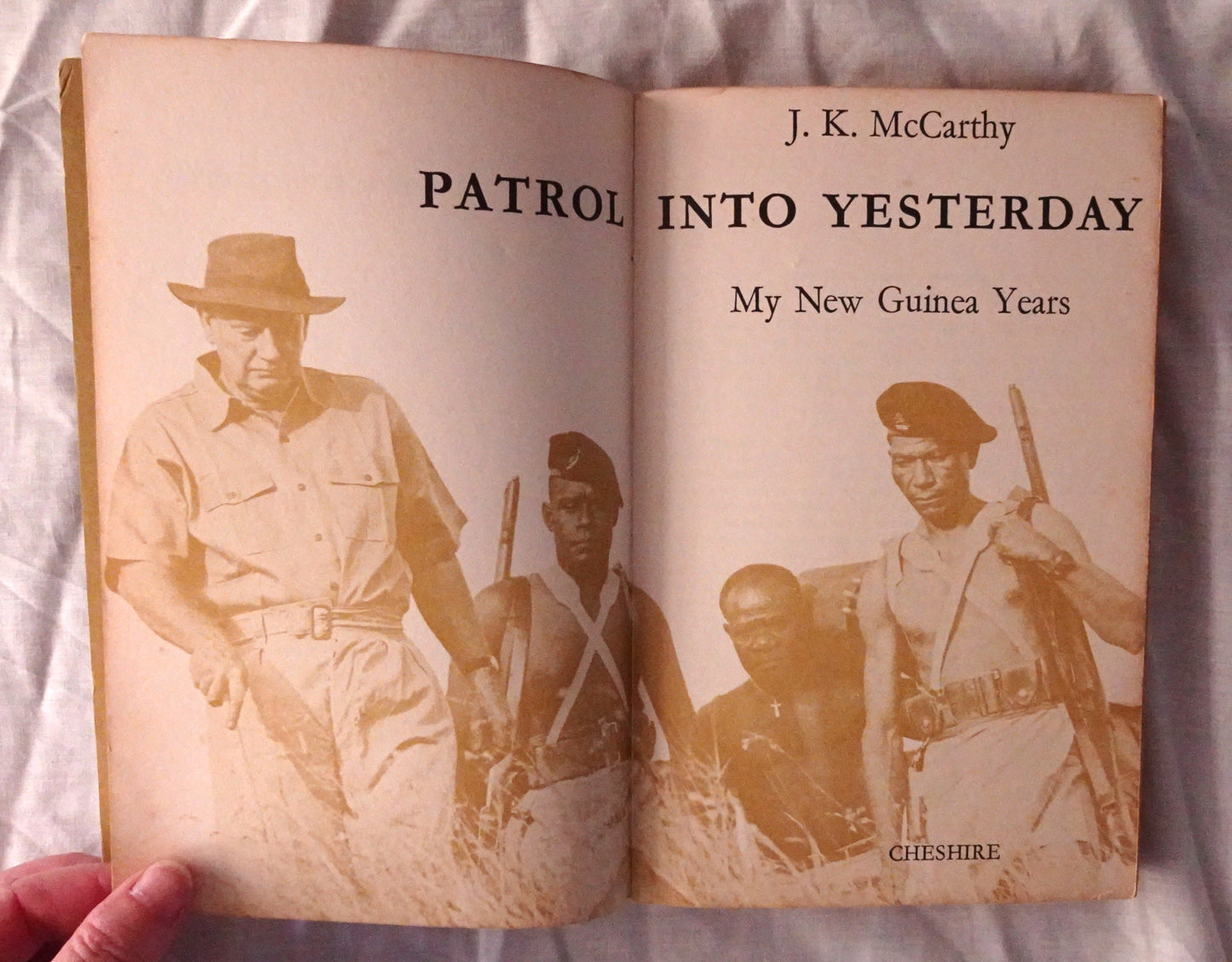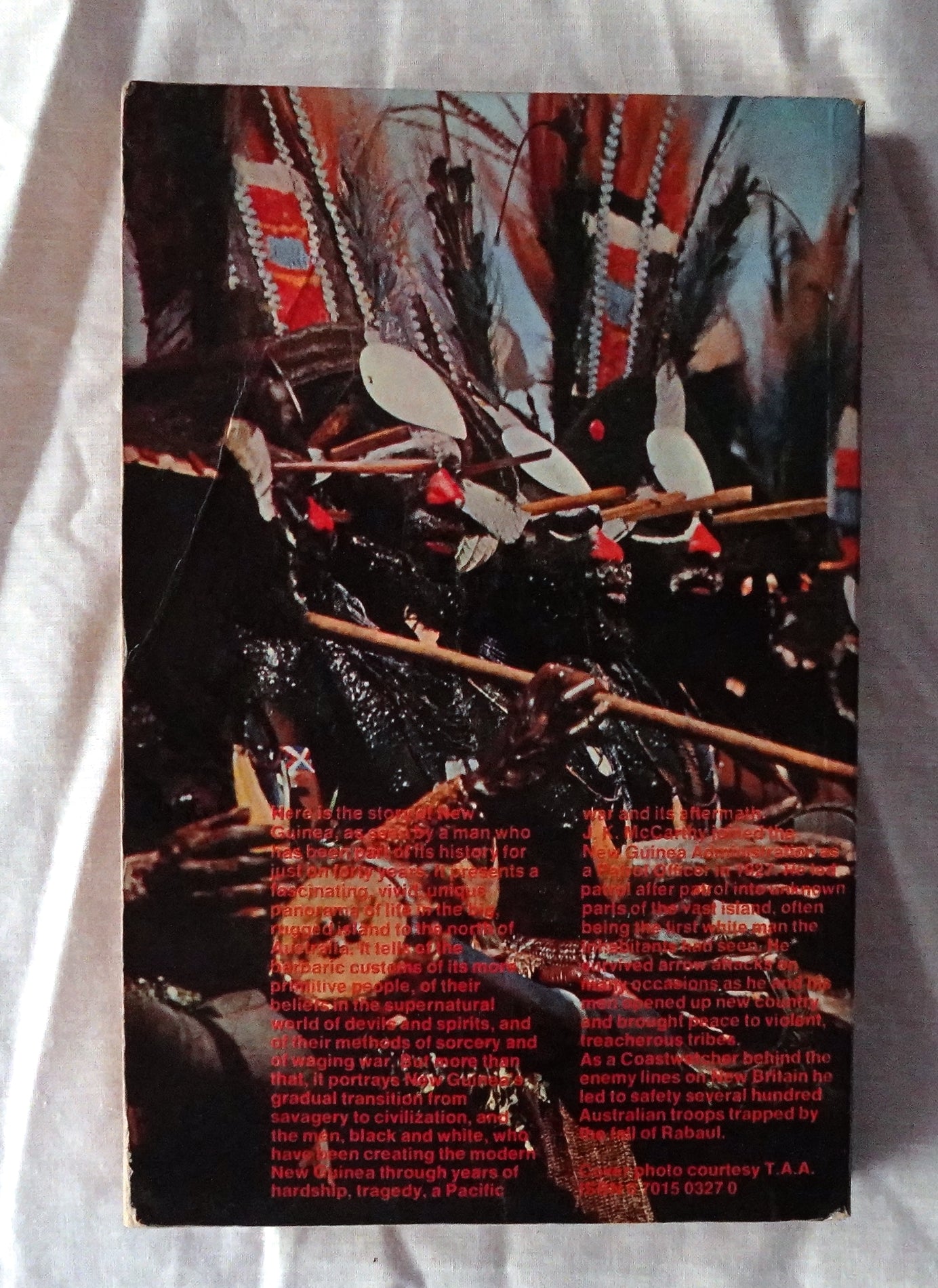 “Here is the story of New Guinea, as seen by a man who has been part of its history for just on forty years. It presents a fascinating vivid unique panorama of life in the big, rugged island to the north of Australia. It tells of the barbaric customs of its more primitive people, of their beliefs in the supernatural world of devils and spirits, and of their methods of sorcery and of waging war. But more than that, it portrays New Guinea’s gradual transition from savagery to civilisation, and the men, black and white, who have been creating the modern New guinea through years of hardship, tragedy, a Pacific war and its aftermath. J.K. McCarthy joined the New guinea Administration as a Patrol Officer in 1927. He led patrol after patrol into unknown parts of the vast island, often being the first white man the inhabitants had seen. He survived arrow attacks on many occasions as he and his men opened up new country and brought peace to violent, treacherous tribes.