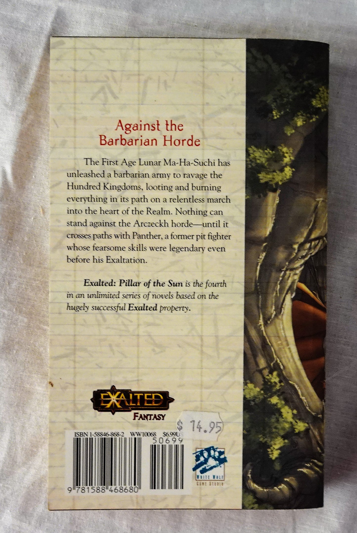“The First Age Lunar Ma-Ha-Suchi has unleashed a barbarian army to ravage the Hundred Kingdoms, looting and burning everything in its path on a relentless march into the heart of the Realm. Nothing can stand against the Arczeckh horde – until it crosses paths with Panther, a former pit fighter whose fearsome skills were legendary even before his Exaltation.”