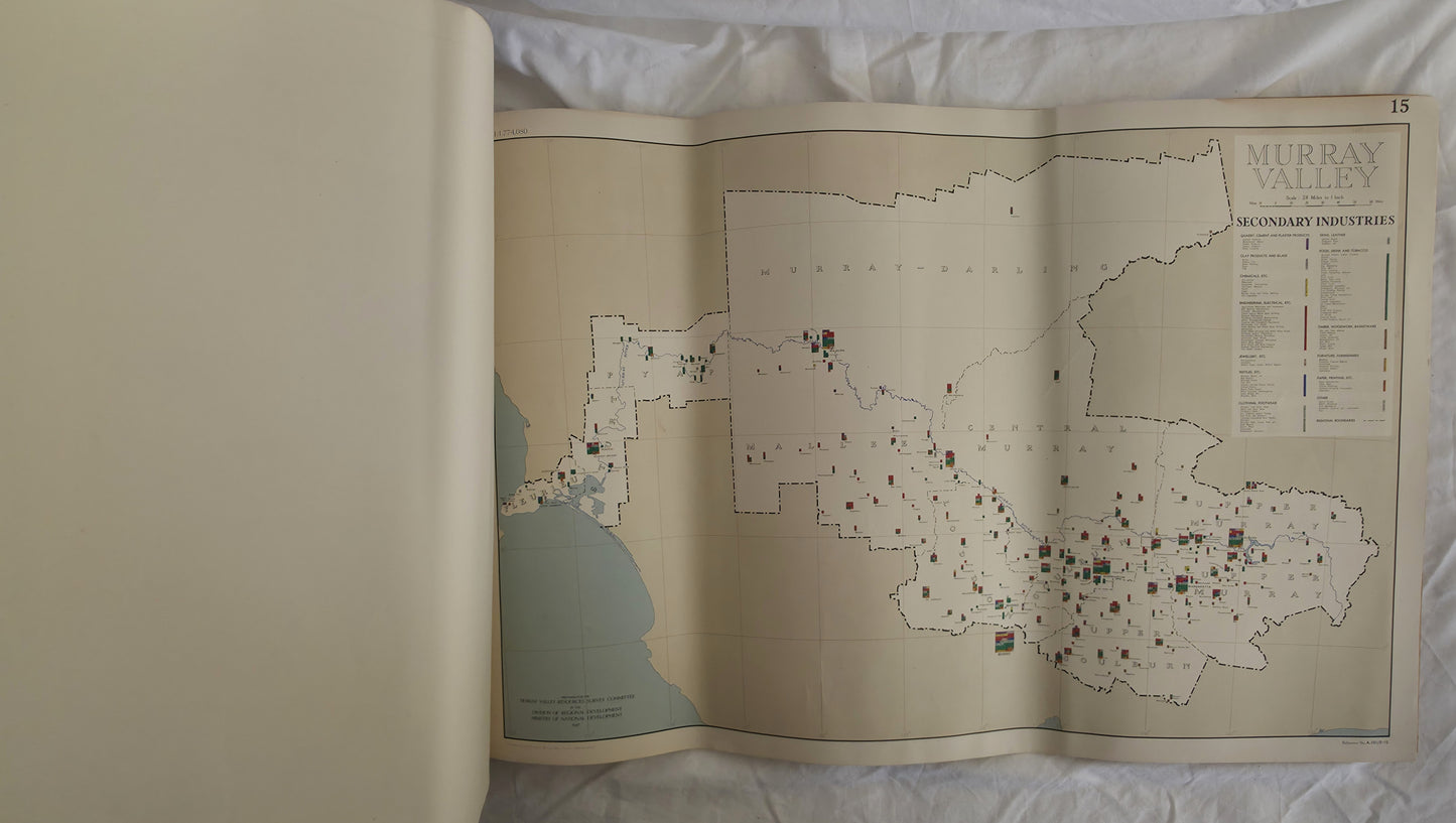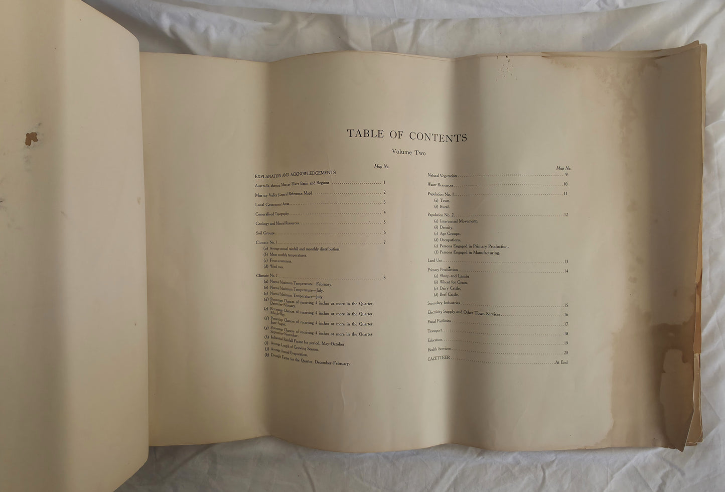 “In this Murray Valley series an attempt is made to provide a comprehensive but relatively detailed pictures of the major economic resources of the region. The thirty-eight separate maps of this atlas presented on twenty sheets demonstrate the potentialities of the area and, at the same time, indicate the Limitations imposed by the environmental and other developmental factors.