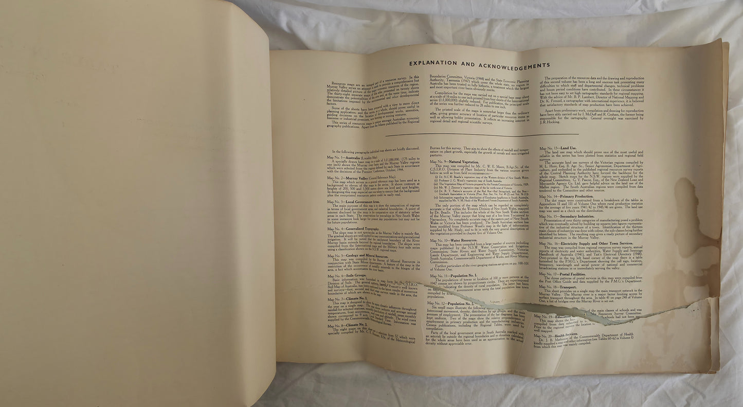 This series of resources maps is a unique amongst Australian economic geography publications. Apart from the Atlases published by the Regional Boundaries Committee, Victoria (1944) and the State Economic Planning Authority, Tasmania (1947) which cover the whole state, no region in Australia has been treated so fully hitherto, a treatment which the largest and most important river basin obviously merits….”