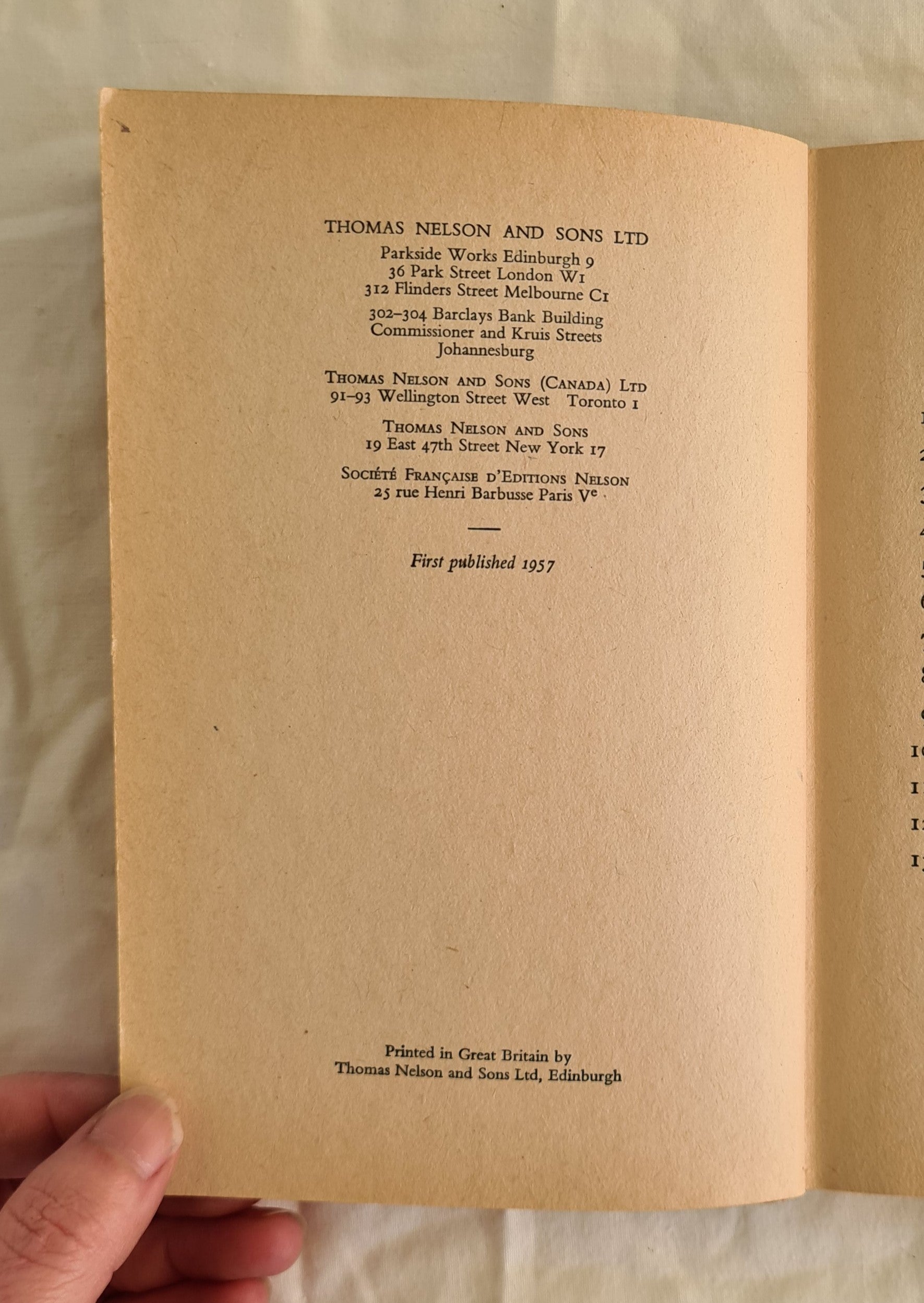 Thomas Nelson and Sons, 1957, [First Edition], black and white illustrations, black and white illustrated frontispiece, hardcover with decorated front cover