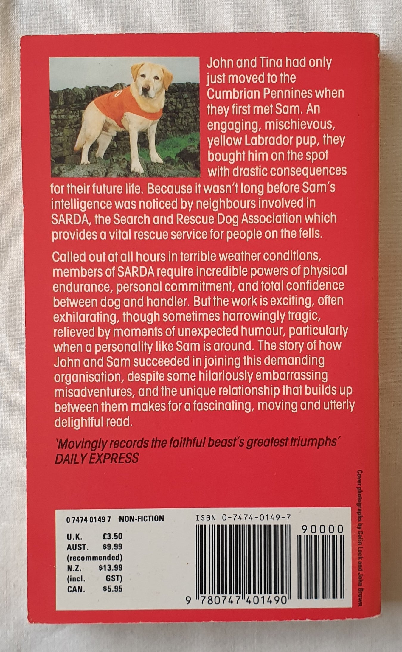 “John and Tina had only just moved to the Cumbrian Pennines when they first met Sam. An engaging, mischievous, yellow Labrador pup, they bought him on the spot with drastic consequences for their future life. Because it wasn’t long before Sam’s intelligence was noticed by neighbours involved in SARDA, the Search and Rescue Dog Association which provides a vital rescue service for people on the fells.