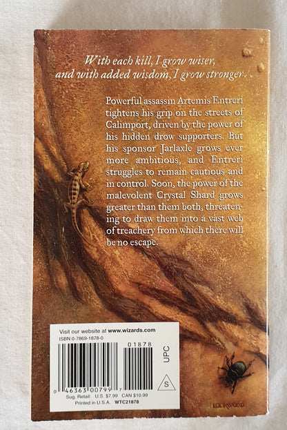 "Powerful assassin Artemis Entreri tightens his grip on the streets of Calimport, driven by the power of his hidden drow supporters. But his sponsor Jarlaxle grows ever more ambitious, and Entreri struggles to remain cautious and in control. Soon, the power of the malevolent Crystal Shard grows greater than them both, threatening to draw them into a vast web of treachery from which there will be no escape."