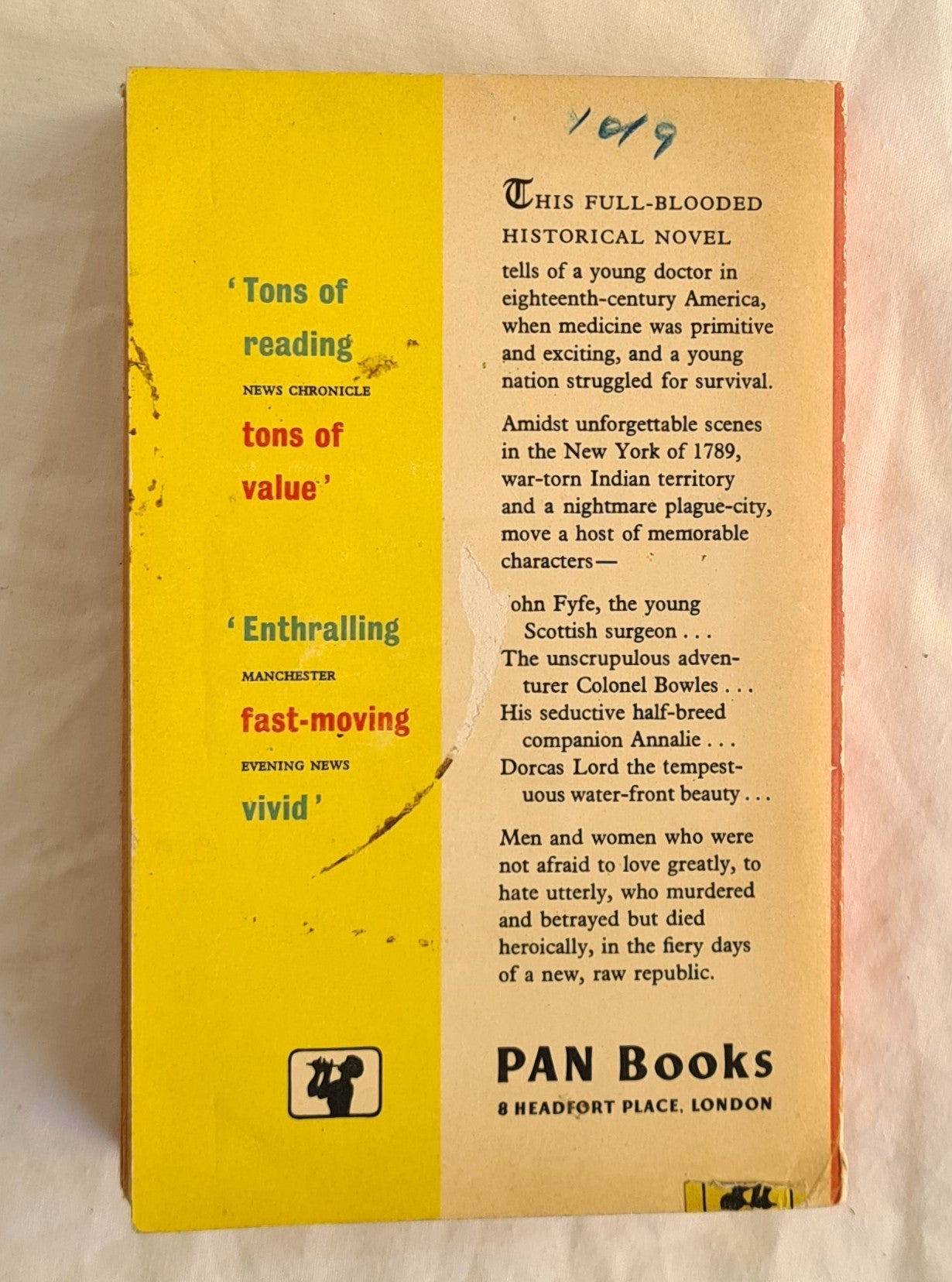 “This full-blooded historical novel tells of a young doctor in eighteenth-century America, when medicine was primitive and exciting, and a young nation struggled for survival. Amidst unforgettable scenes in the New York of 1789, war-torn Indian territory and a nightmare plague-city, move a host of memorable characters – John Fyfe, the young Scottish surgeon… The unscrupulous adventurer Colonel Bowles … His seductive half-breed companion Annalie … Dorcas Lord the tempestuous water-front beauty … Men and women who were not afraid to love greatly, to hate utterly, who murdered and betrayed but died heroically, in the fiery days of a new, raw republic.”