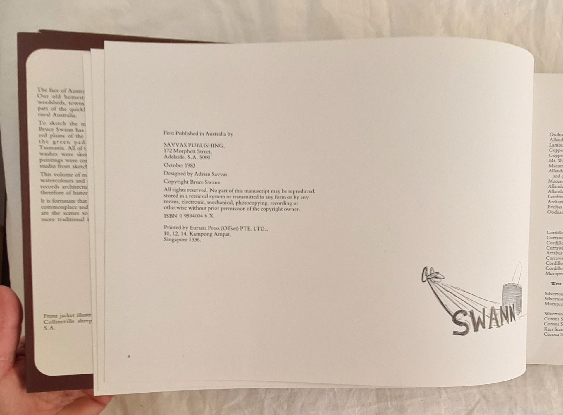To sketch the material for this book, Bruce Swann has travelled from the vast red plains of the Northern Territory to the green paddocks of southern Tasmania. All of the drawings and colour washes were sketched on site. The oil paintings were completed in his Adelaide studio form sketchbook notes.