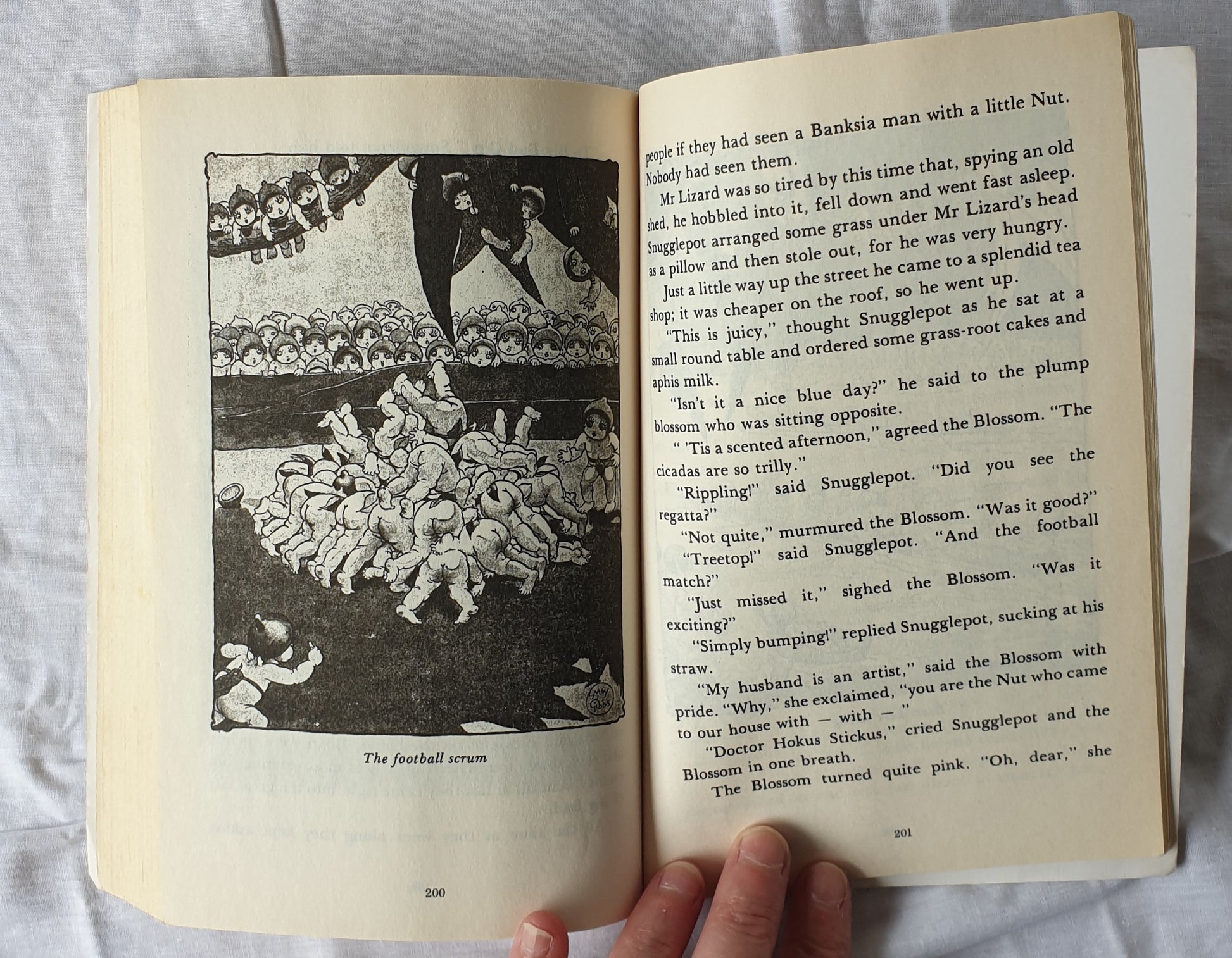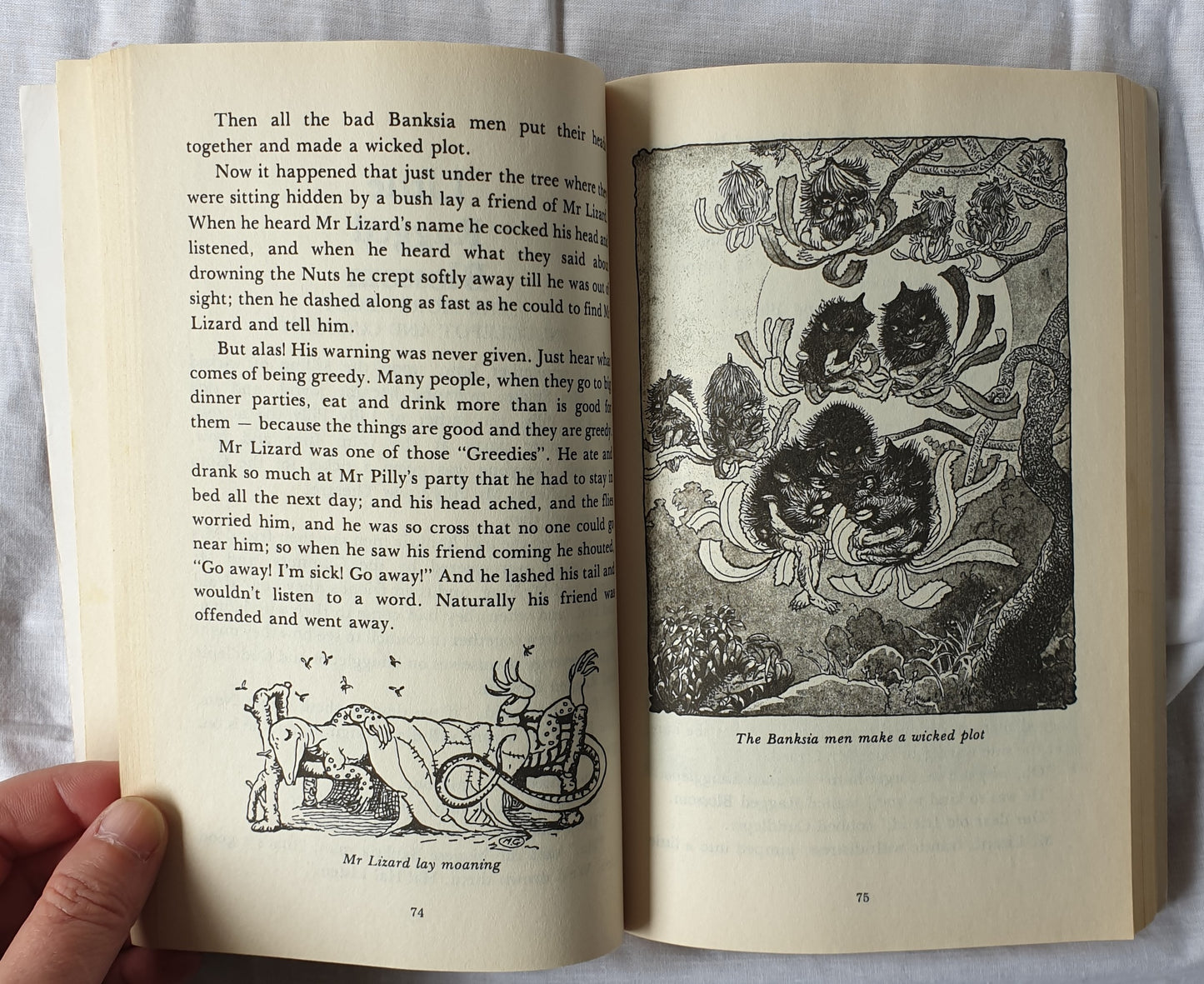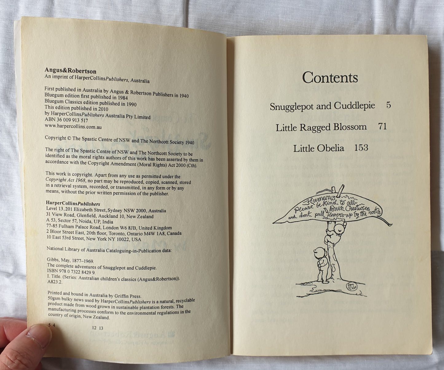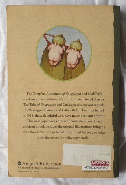 “The Complete Adventures of Snugglepot and Cuddlepie combines in one edition, May Gibbs’ much loved classics, The Tales of Snugglepot and Cuddlepie and its two sequels, Little Ragged Blossom and Little Obelia.  First published in 1918, these delightful tales have never been out of print.  This new paperback edition of Australia’s best-loved children’s book includes the original illustrations bringing alive the enchanting world of the gumnut babies and other bush characters for today’s generation.”