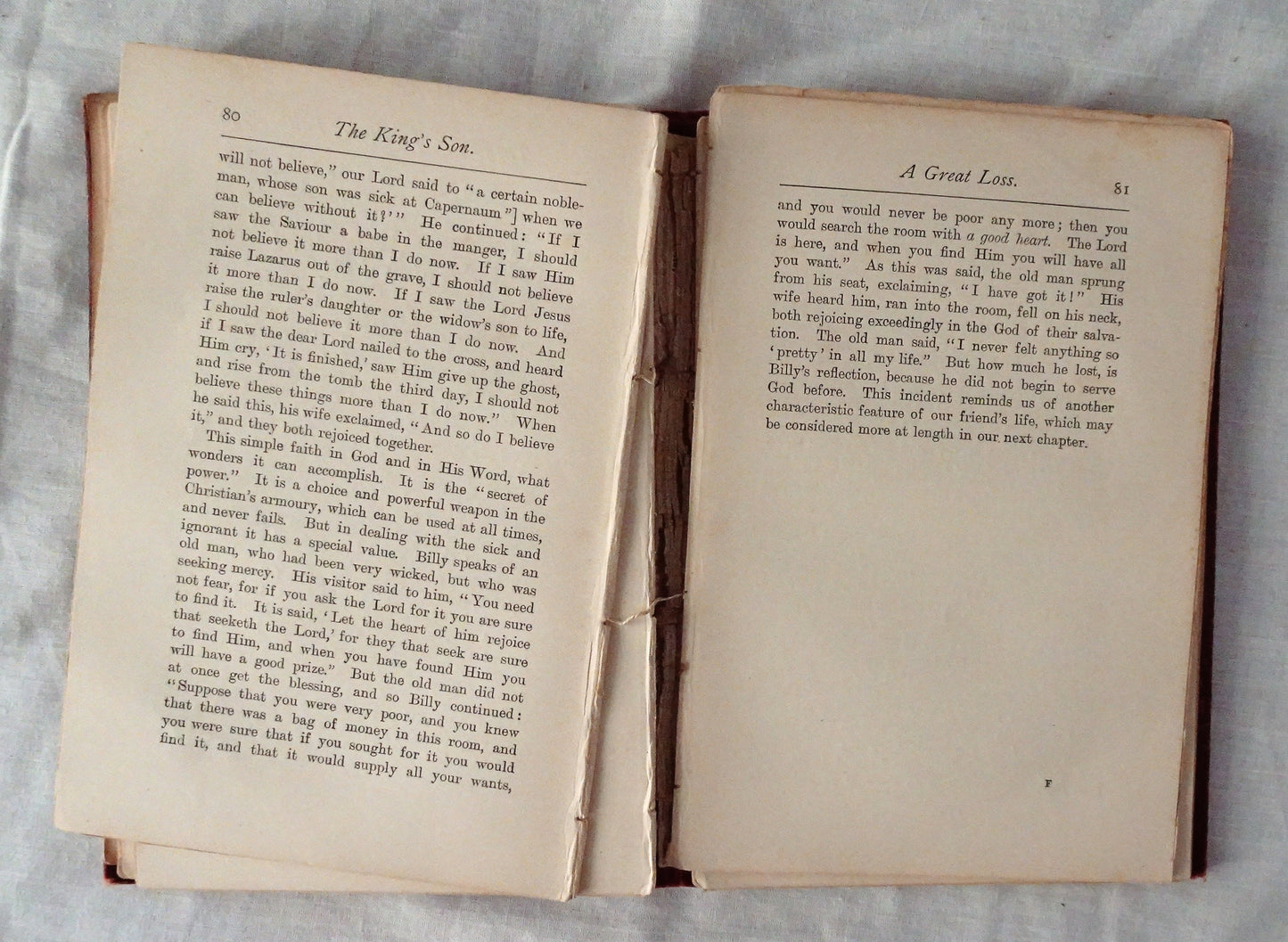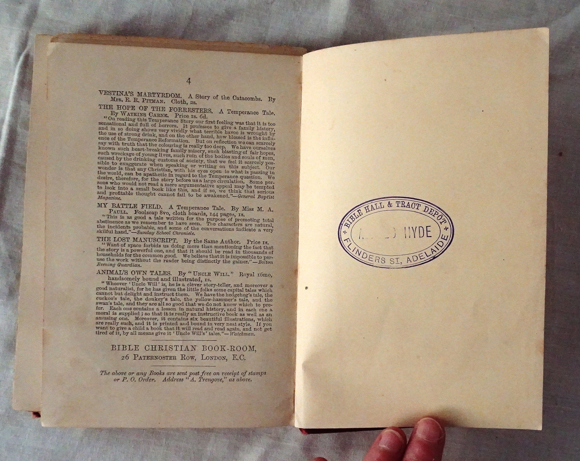 Bible Christian Book-Room, Simpkin, Marshall, Hamilton, Kent & Co., 1895, illustrated frontispiece, lightly illustrated with black and white illustrations in text, hardcover with red cloth cover and embossed illustrations, gilded title on cover and spine