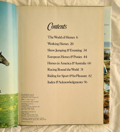 “Dramatic photographs of rodeo, show jumping and racing, rare and beautiful pictures of little-known breeds from Eastern Europe and South America and irresistible portraits of loveable ponies and foals – these are some of the superb colour illustrations in this book.