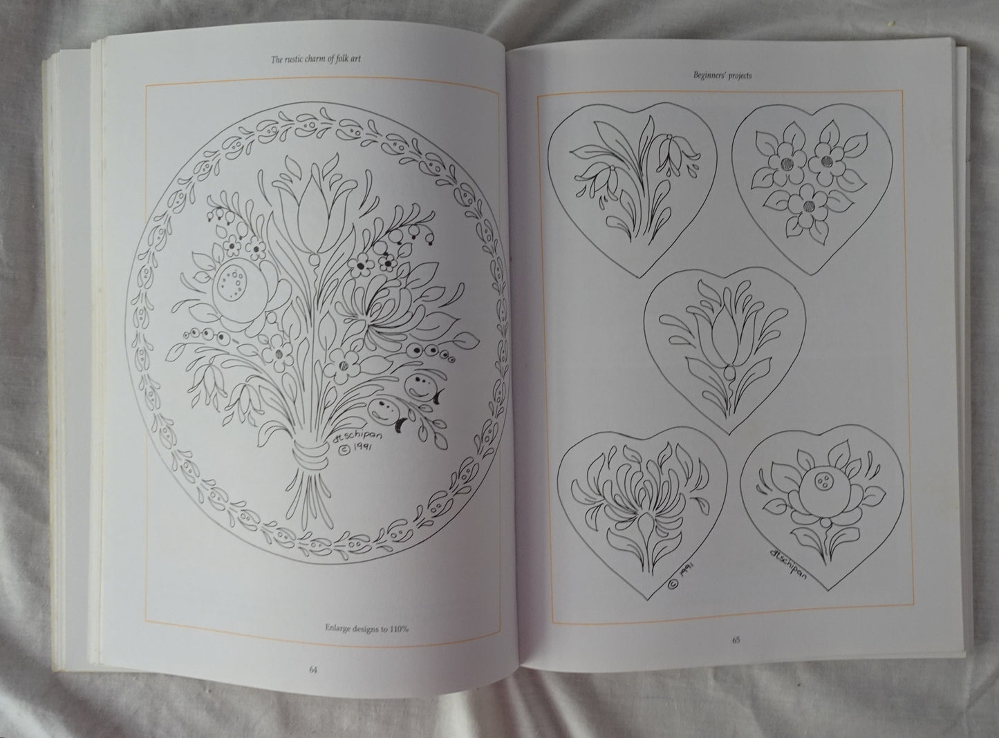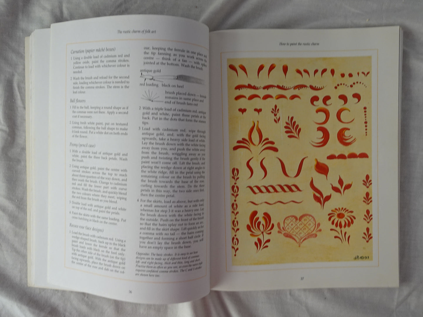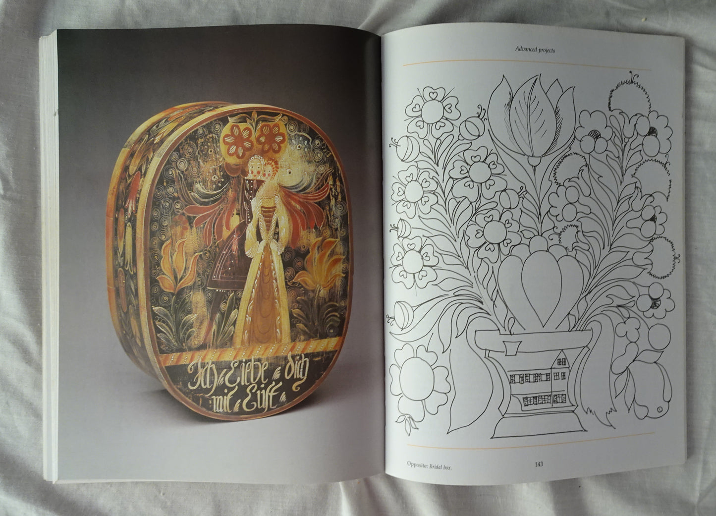 “This is a book for those who want to throw perfection to the winds and be creative for themselves, without fear of failure. Folk art springs from the age-old desire of people living in simple surroundings to make things beautiful: painting on wood practised originally by Bavarian peasants. It is a craft developed in a domestic setting by painters without training and is by nature naïve. Beginners and experienced craftspeople alike can use its techniques with deeply satisfying results.