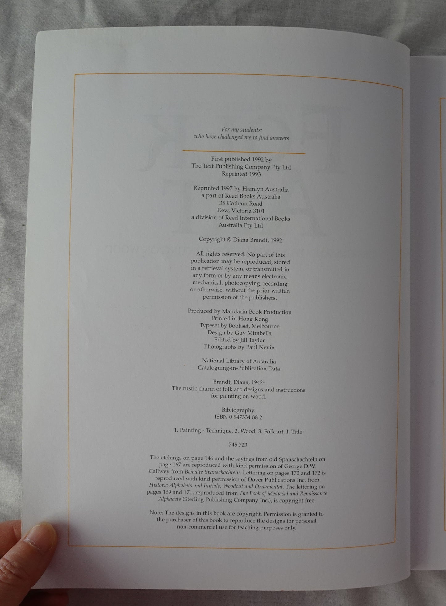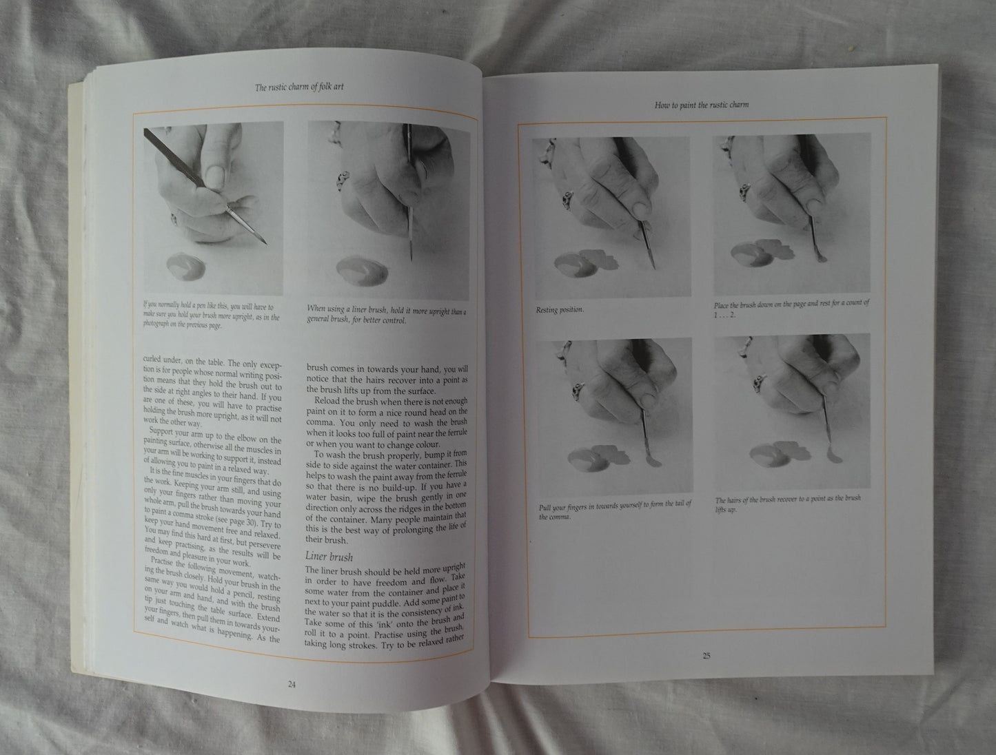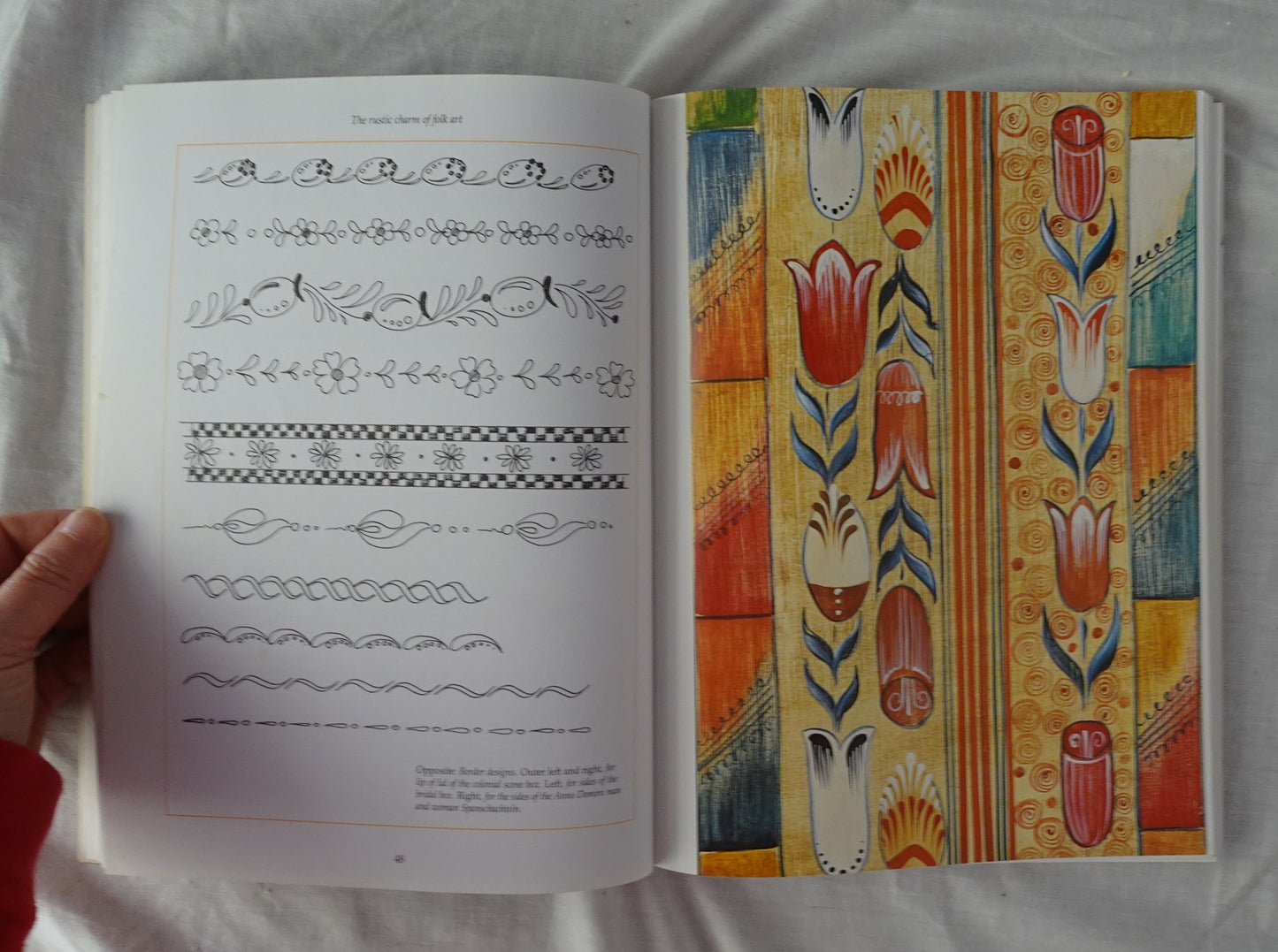 “This is a book for those who want to throw perfection to the winds and be creative for themselves, without fear of failure. Folk art springs from the age-old desire of people living in simple surroundings to make things beautiful: painting on wood practised originally by Bavarian peasants. It is a craft developed in a domestic setting by painters without training and is by nature naïve. Beginners and experienced craftspeople alike can use its techniques with deeply satisfying results.