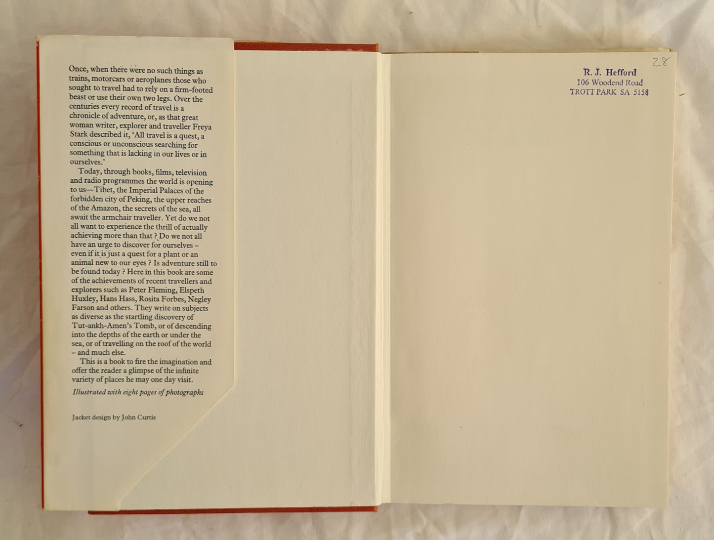 “…Tibet, the Imperial Palaces of the forbidden city of Peking, the upper reaches of the Amazon, the secrets of the sea, all await the armchair traveller. Yet do we do not all want to experience the thrill of actually achieving more than that? Do we not all have an urge to discover for ourselves – or even if it is just a quest for a plant or an animal new to our eyes? Is adventure still to be found today? Here in this book are some of the achievements of recent travellers an explorers such as Peter Fleming, Elspeth Huxley, Hans Hass, Rosita Forbes, Negley Farson and others. They write on subjects as diverse as the startling discovery of Tut-ankh-Amen’s Tomb, or of descending into the depths of the earth or under the sea, or of travelling on the roof of the world – and much else.”