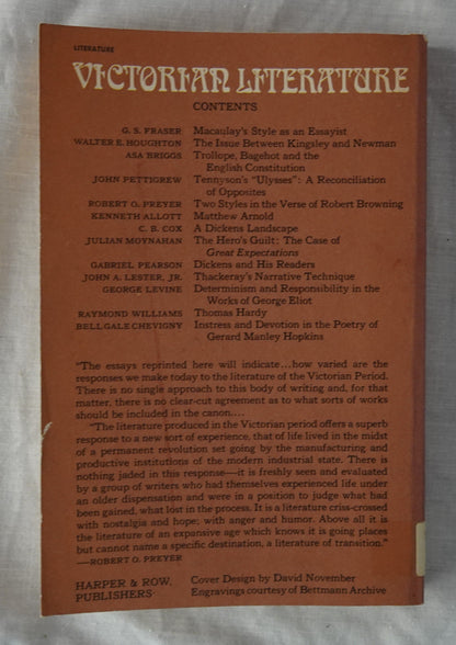 “The essays reprinted here will indicate … how varied are the responses we make today to the literature of the Victorian Period. There is no single approach to this body of writing and, for that matter, there is no clear-cut agreement as to what sorts of works should be included in the canon…”