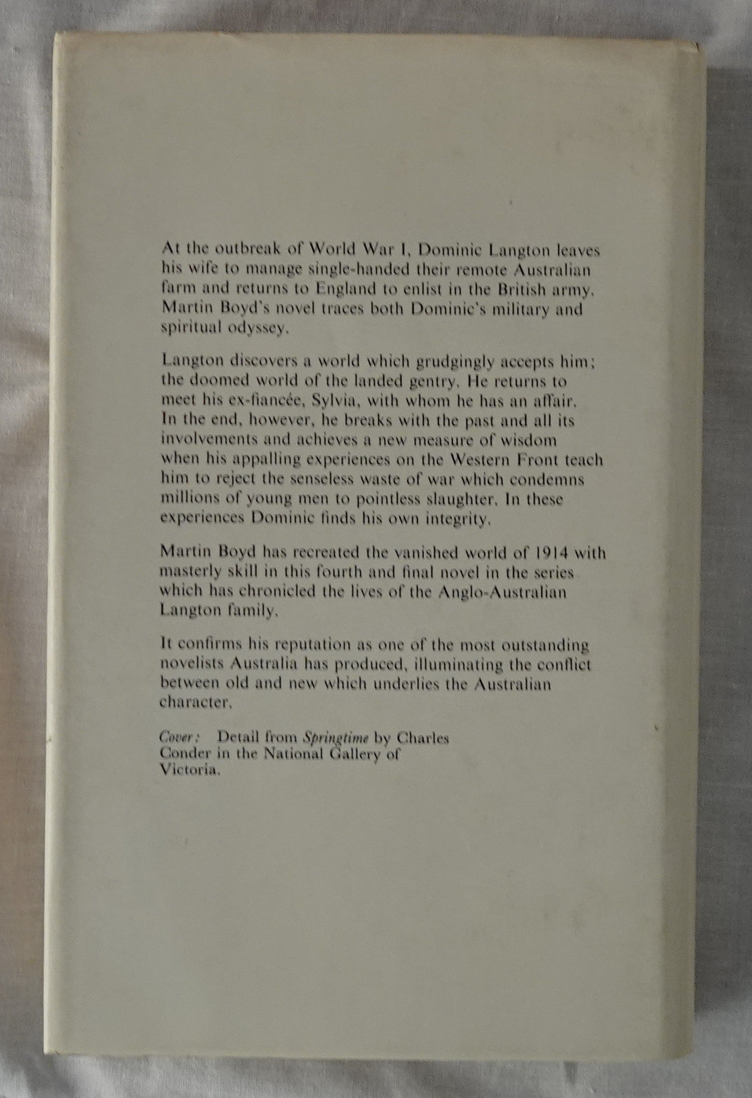 Martin Boyd’s novel traces both Dominic’s military and spiritual odyssey. Langton discovers a world which grudgingly accepts him; the doomed world of the landed gentry. He returns to meet his ex-fiancée, Sylvia, with whom he has an affair.